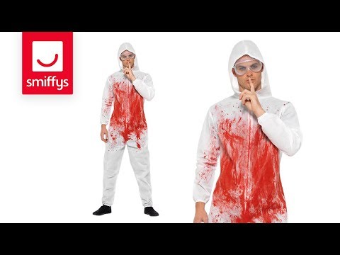 Oikeuslääkärin verinen suojahaalari ja suojalasit