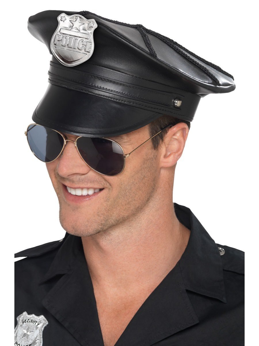Tukeva ja näyttävä koppalakki-mallinen poliisihattu mustaa tekonahkaa, poliisimerkki edessä.