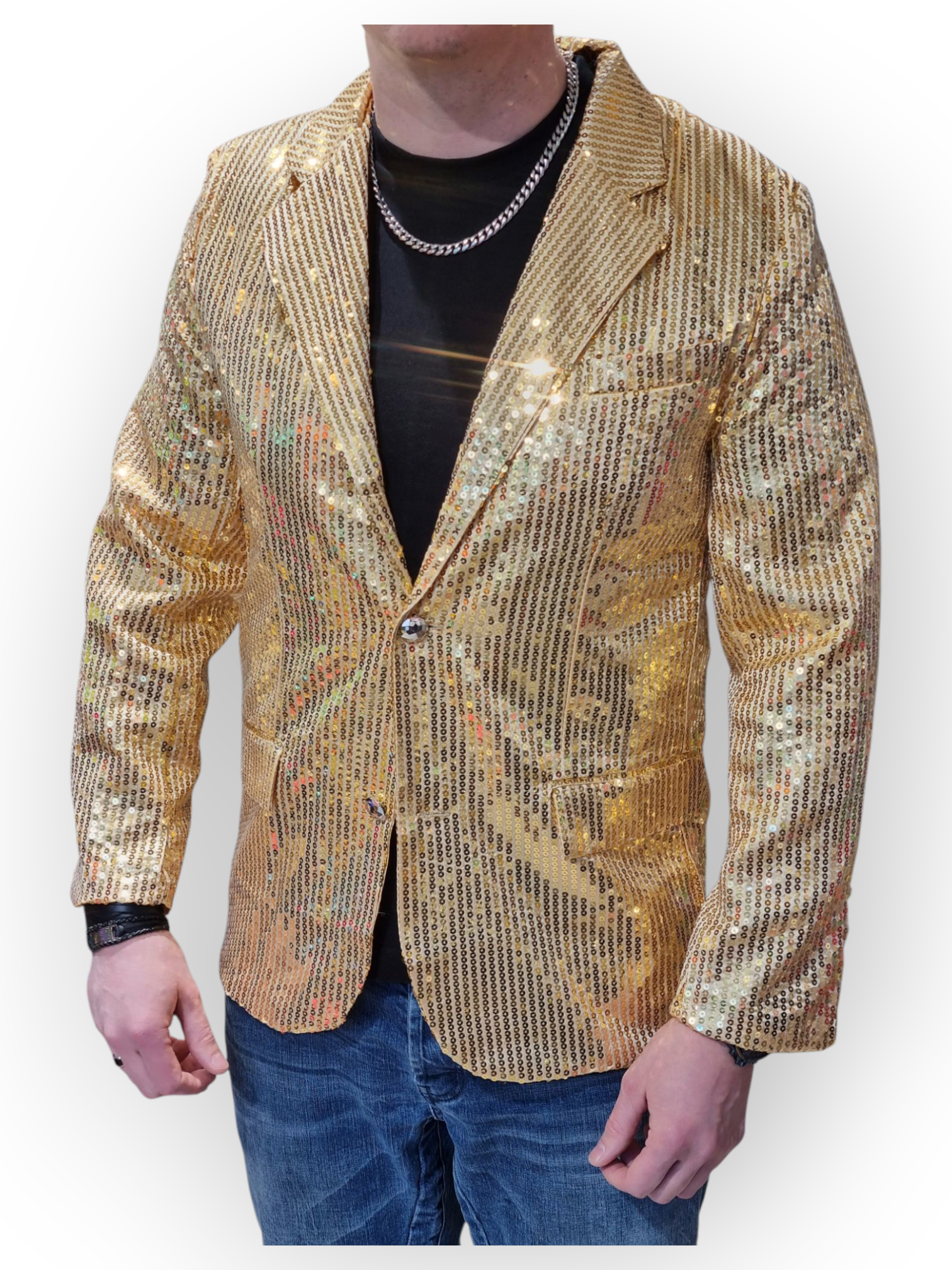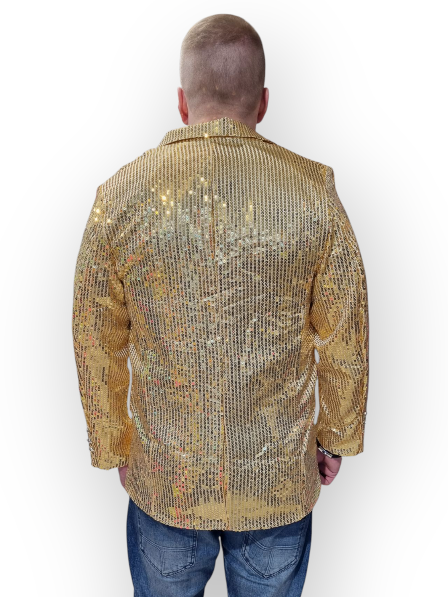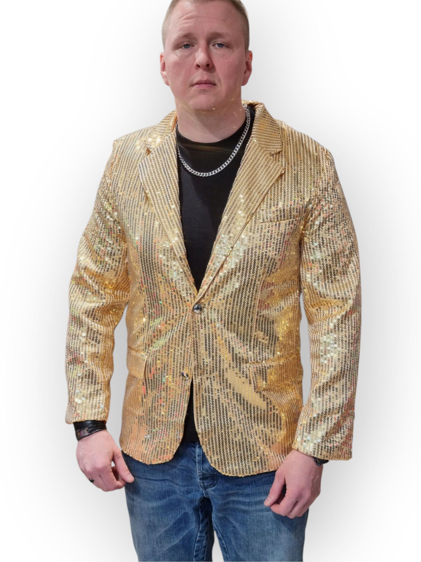 Järjettömän päräyttävä paljettipintainen takki, jossa sädehdit parkettien partaveitsenä ja discon kuumimpana jäbänä. Tämä kullanvärinen discotakki ei ole pelkästään hieno, vaan myös yllättävän mukava päällä: muihin vastaaviin tuotteisiin verraten tässä on sisässä kauttaaltaan oleva, hihansuihihin asti ulottuva vuori ja edessä rintatasku taskuliinaa varten. Miehustan alemmat taskut ovat valetaskut. Näyttävät napit edessä ja hihansuissa. Paljettipinta peittää takin kauttaaltaan, ja paljetit heijastavat valoa voimakkaasti.