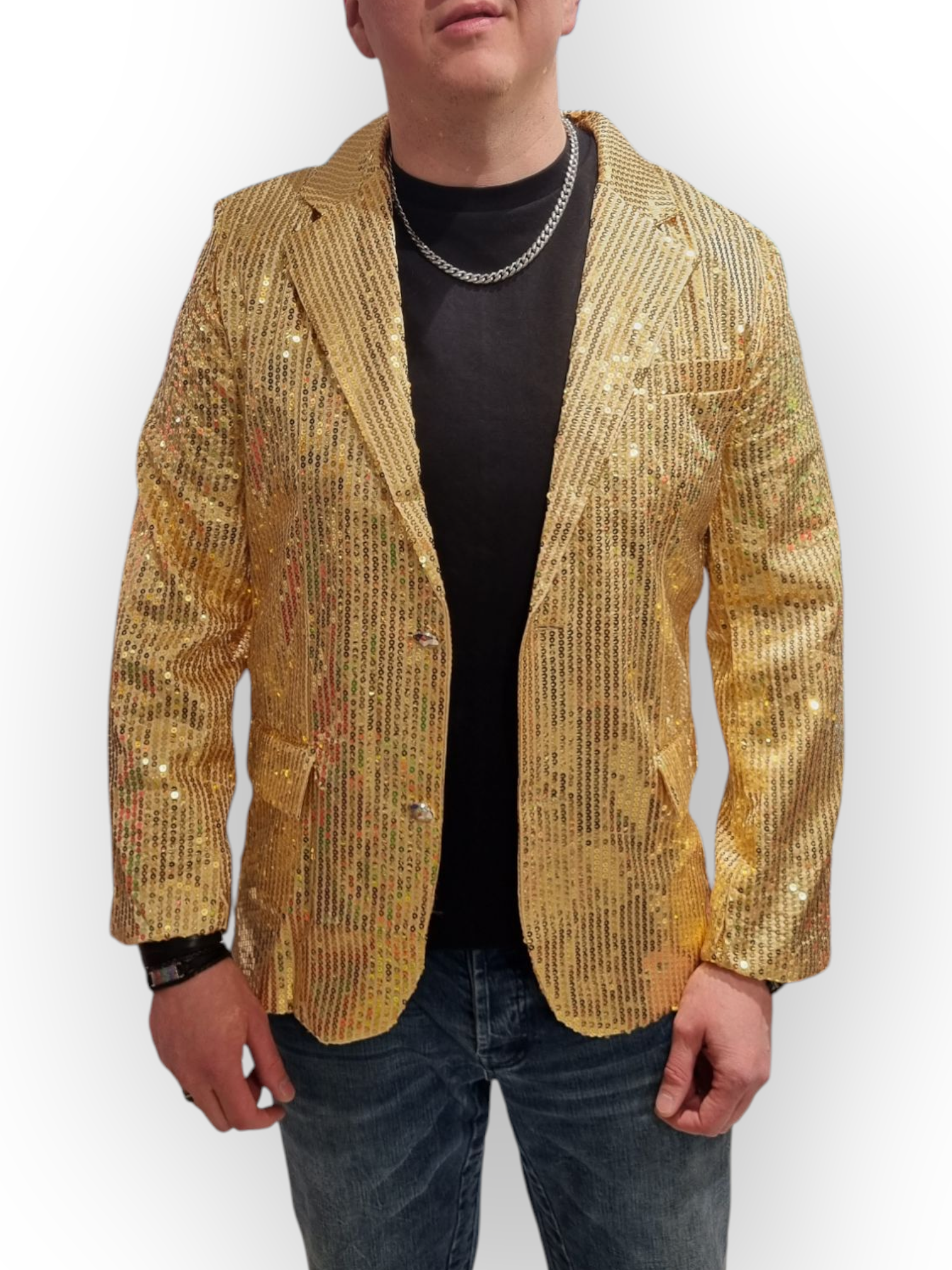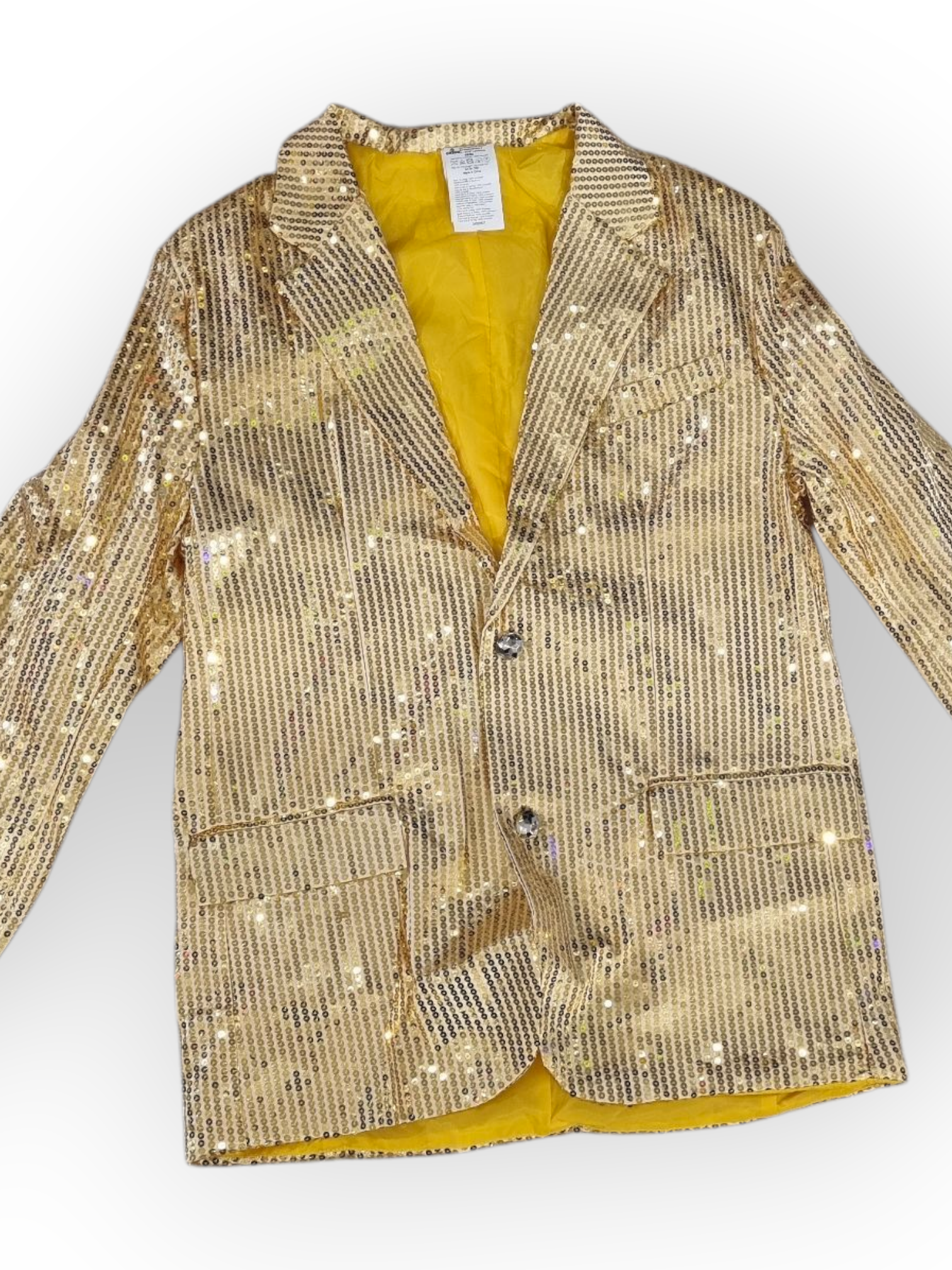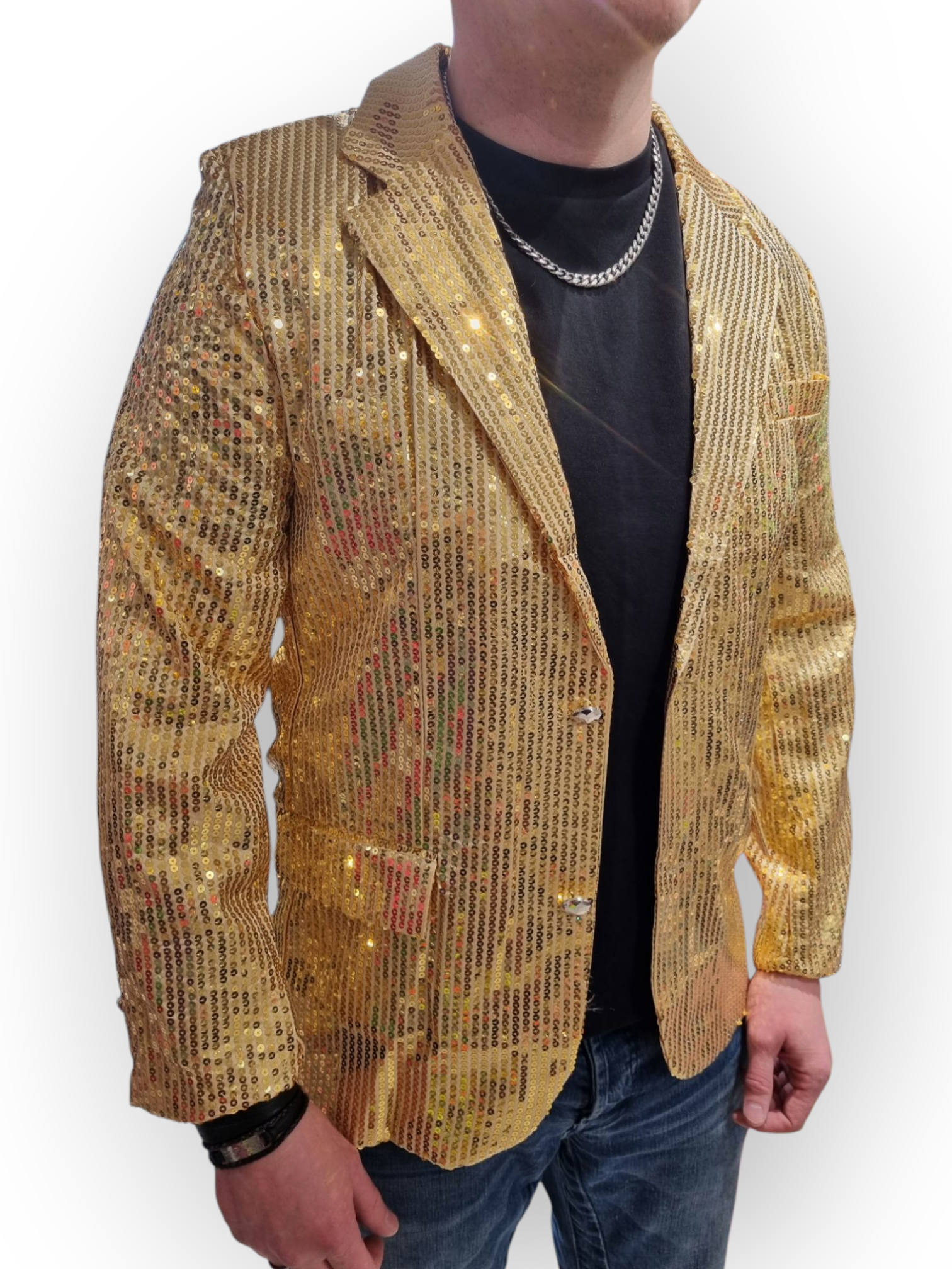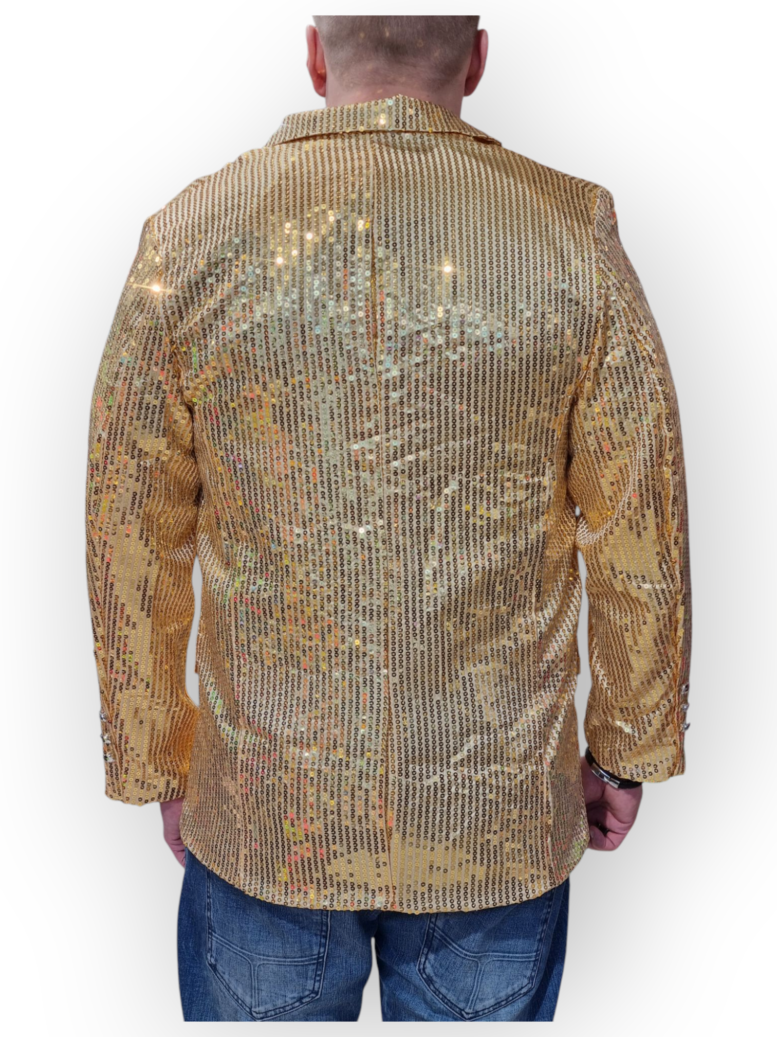 Järjettömän päräyttävä paljettipintainen takki, jossa sädehdit parkettien partaveitsenä ja discon kuumimpana jäbänä. Tämä kullanvärinen discotakki ei ole pelkästään hieno, vaan myös yllättävän mukava päällä: muihin vastaaviin tuotteisiin verraten tässä on sisässä kauttaaltaan oleva, hihansuihihin asti ulottuva vuori ja edessä rintatasku taskuliinaa varten. Miehustan alemmat taskut ovat valetaskut. Näyttävät napit edessä ja hihansuissa. Paljettipinta peittää takin kauttaaltaan, ja paljetit heijastavat valoa voimakkaasti.