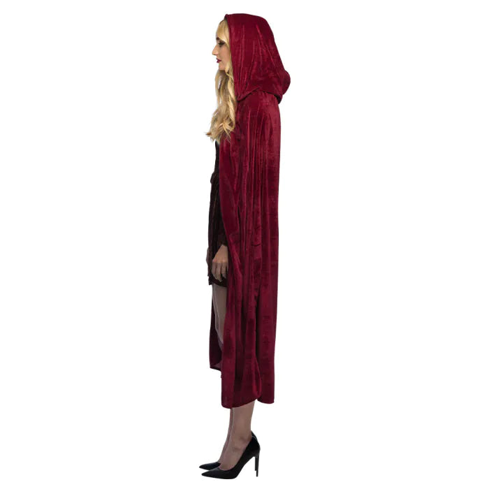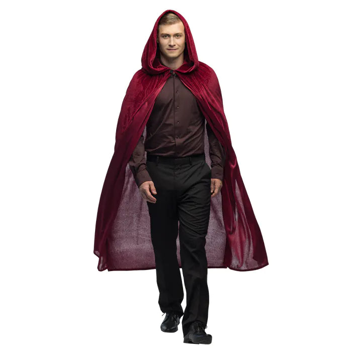 Viininpunainen, kauniisti välkehtivä hupullinen samettipintainen viitta teemajuhliin ja erilaisiin muihin asuihin.