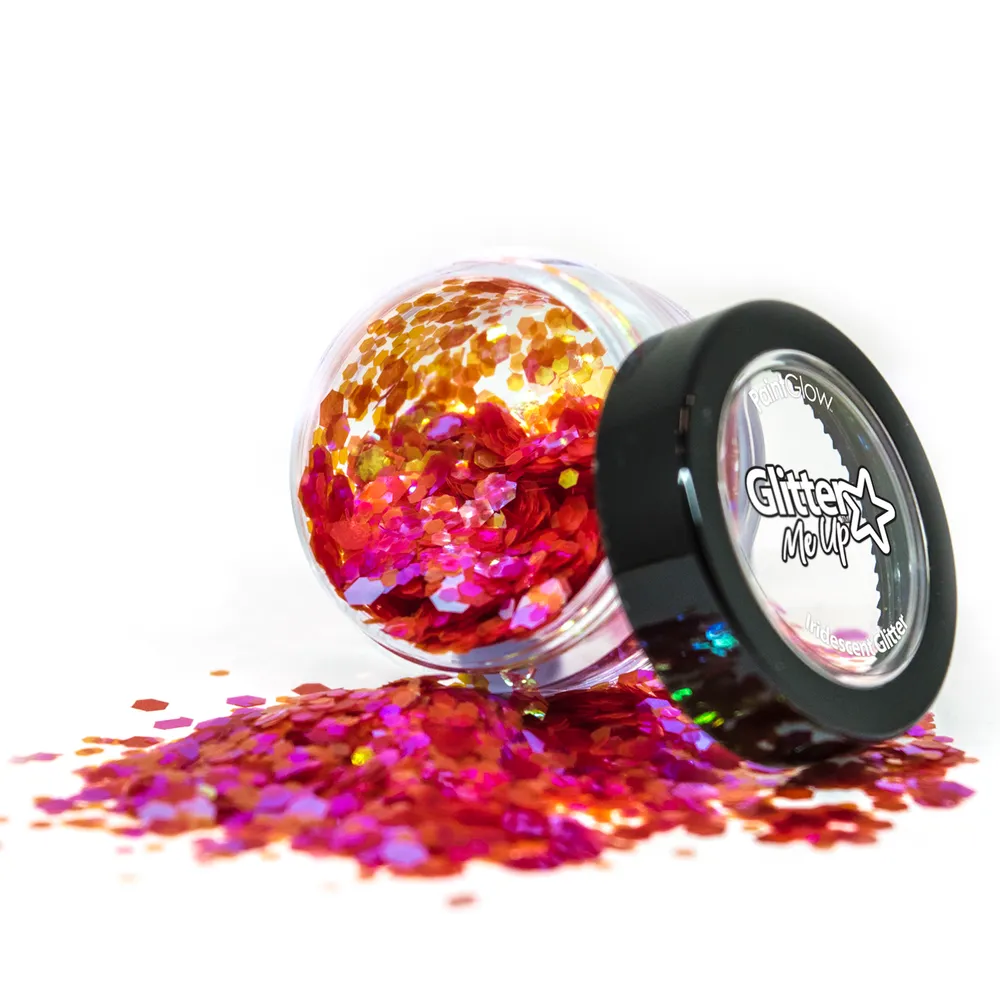 Isohileinen glittersekoitus läpikuultavaa iridescent-glitteriä, jossa väreinä tulinen oranssi sekä ripaus korallia ja keltaista.