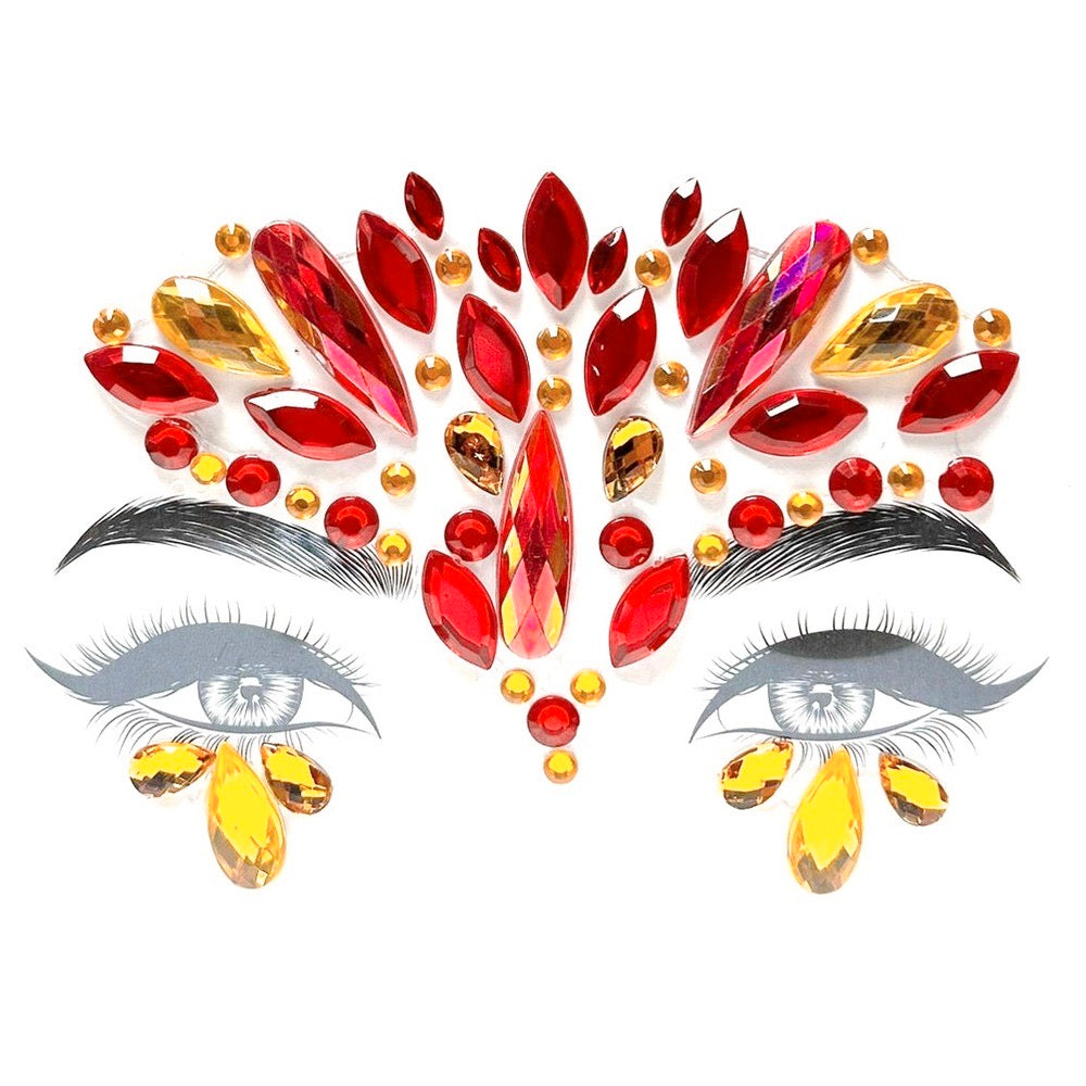 Superhelppo tapa tehdä näyttävät kimalteet kasvoille esimerkiksi hippityyliseen asuun, festareille tai reiveihin! Punaisen ja keltaisen sävyisistä strasseista muodostuva kasvotimanttisetti kiinnitetään kasvoille valmiina kuviona yhtenäisen liimapinnan avulla.