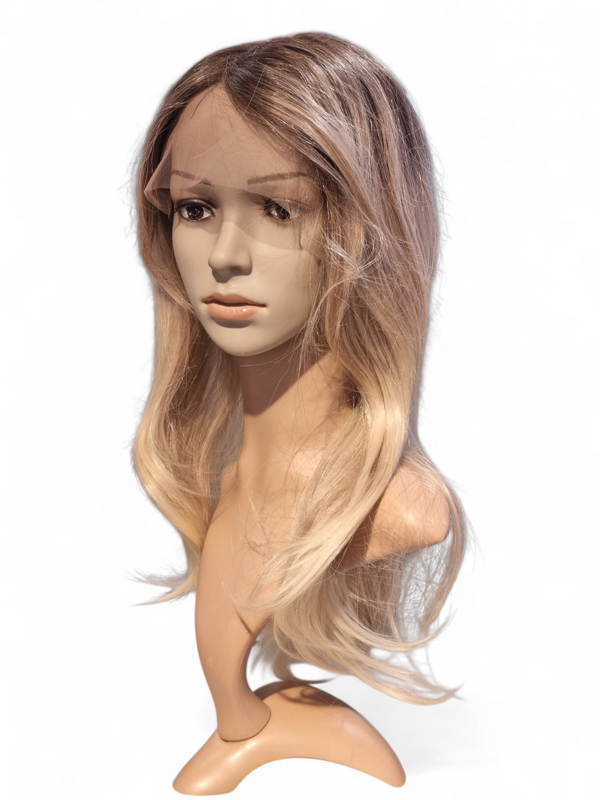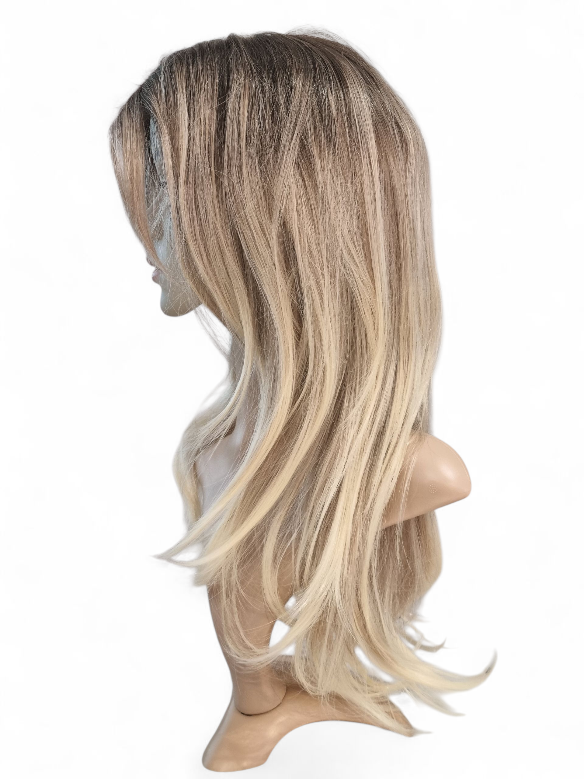 Todella luonnollisen ja aidon näköinen peruukki, jossa hieman tummempi tyvi ja liukuväri blondiin latvaan. Kevyesti laineilla oleva kuitu, edessä kevyt keskijakaus, joka voidaan muotoilla myös kevyiksi otsahiuksiksi.