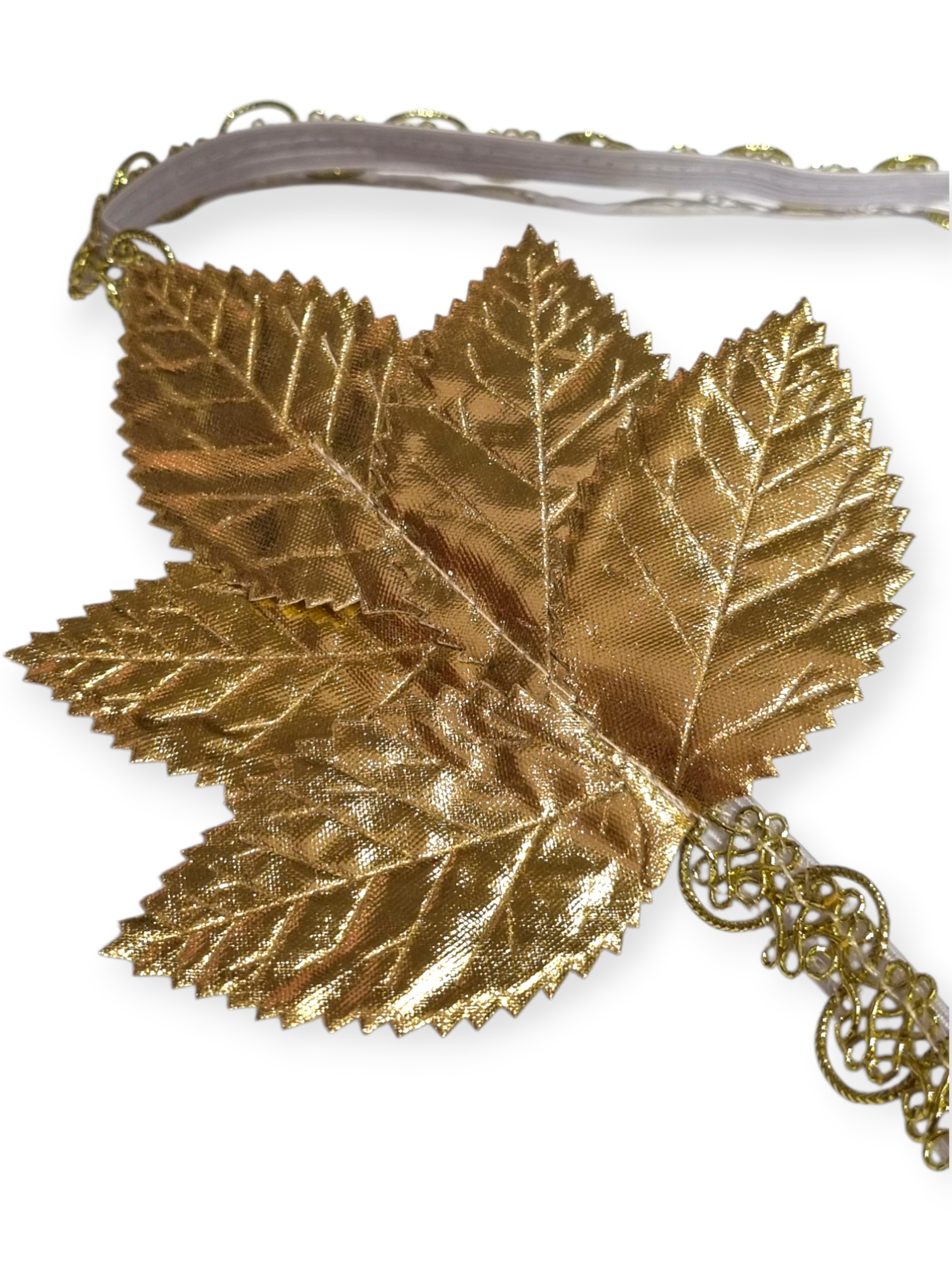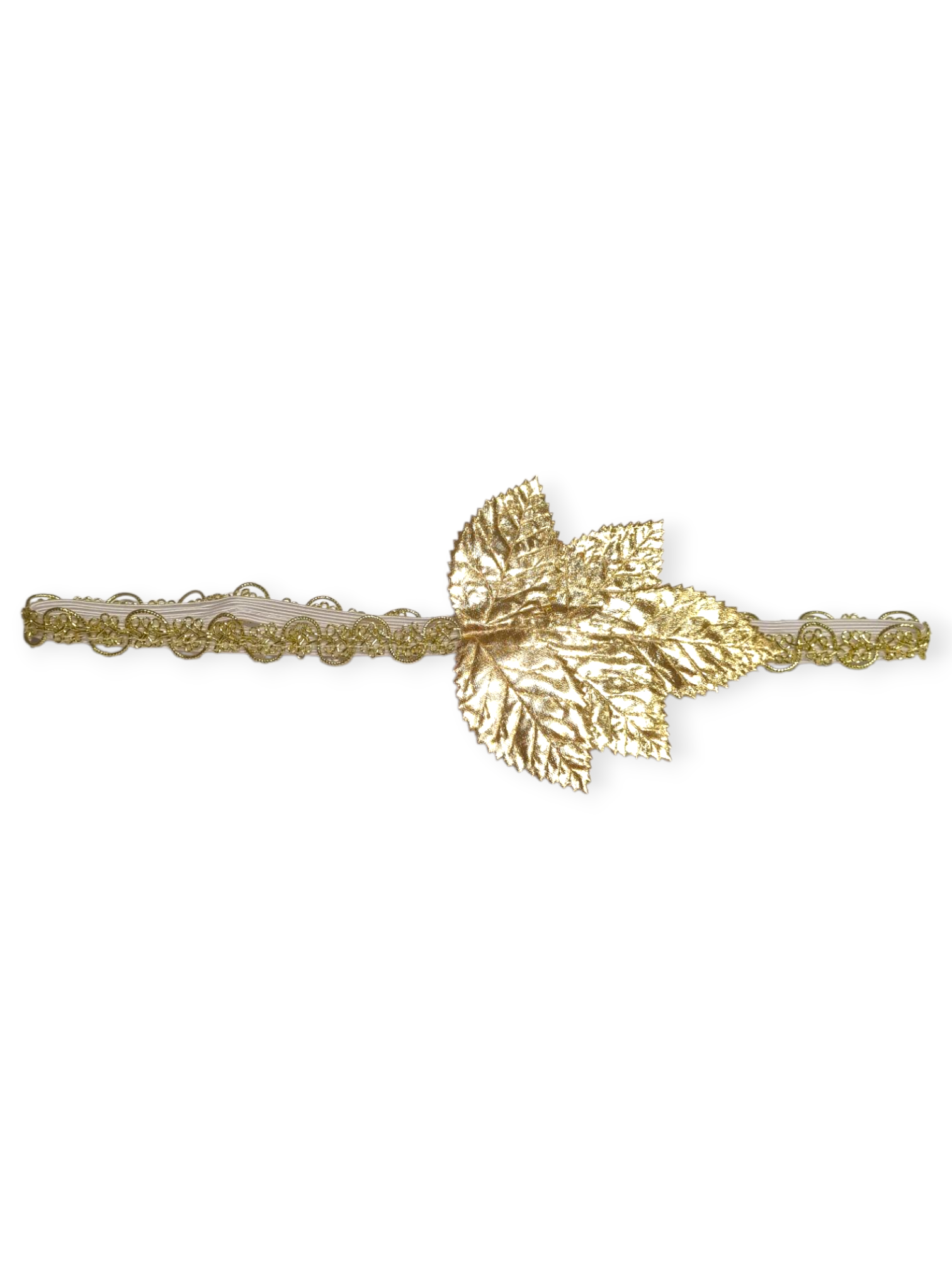Ei ihan laakeriseppele, mutta melkein: kuminauhaan tehty kullanvärinen pääpanta kultaisella lehtikoristeella.