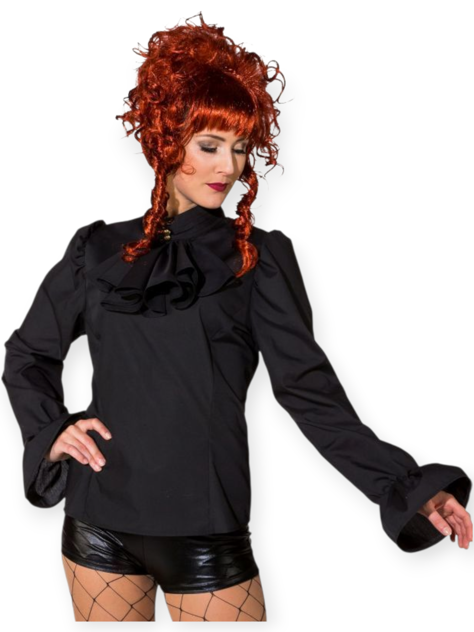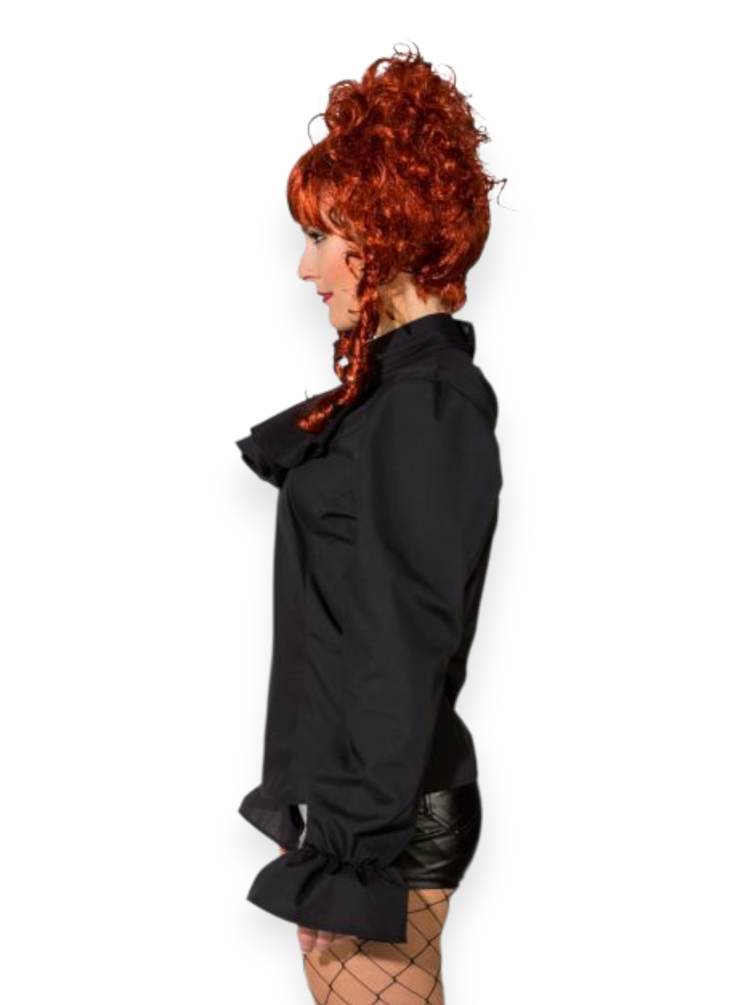 Kaunis musta paitapusero, jossa röyhelökaulus ja röyhelöhihat. Edessä muotolaskokset, hihoissa istutukset.