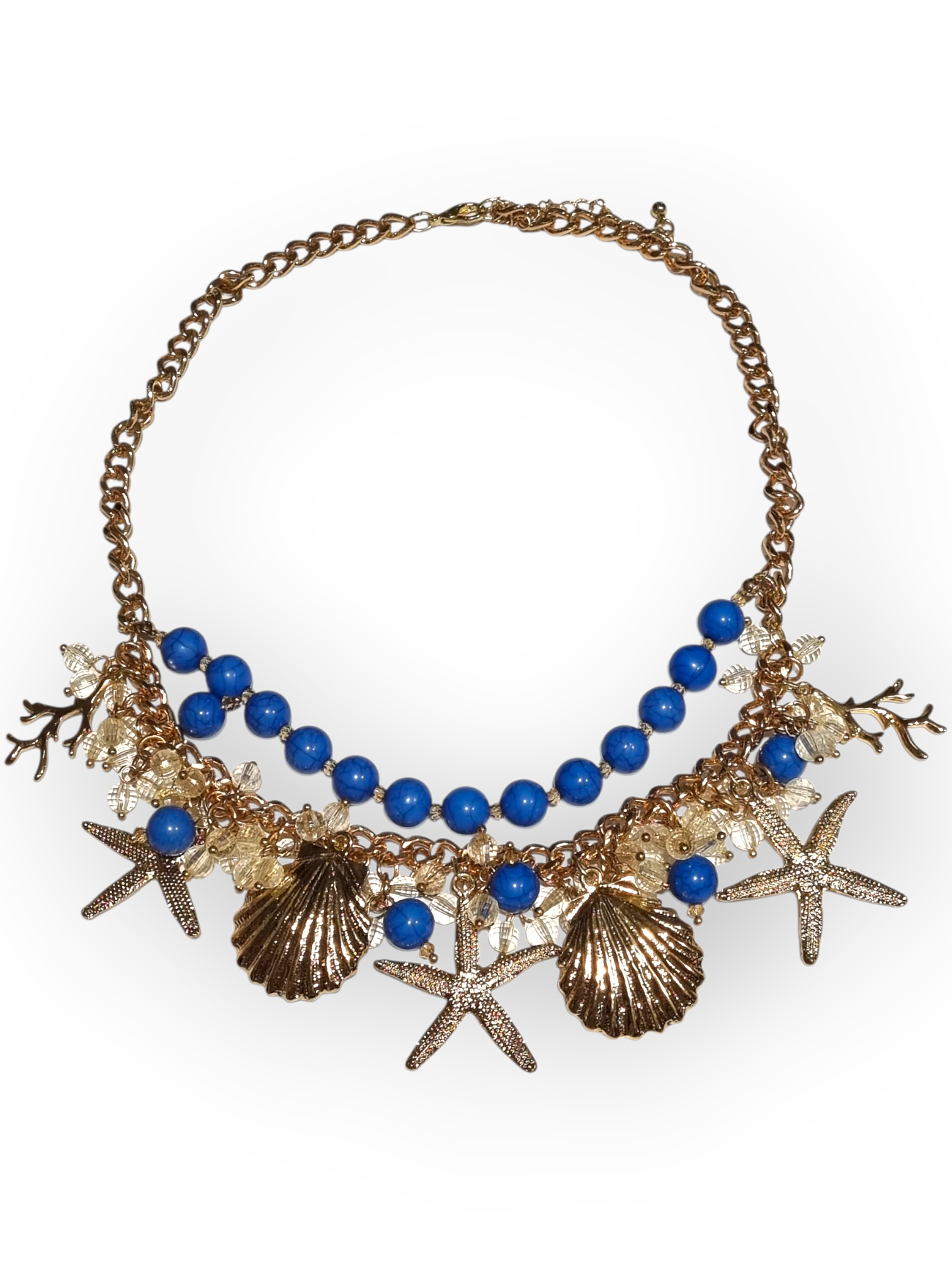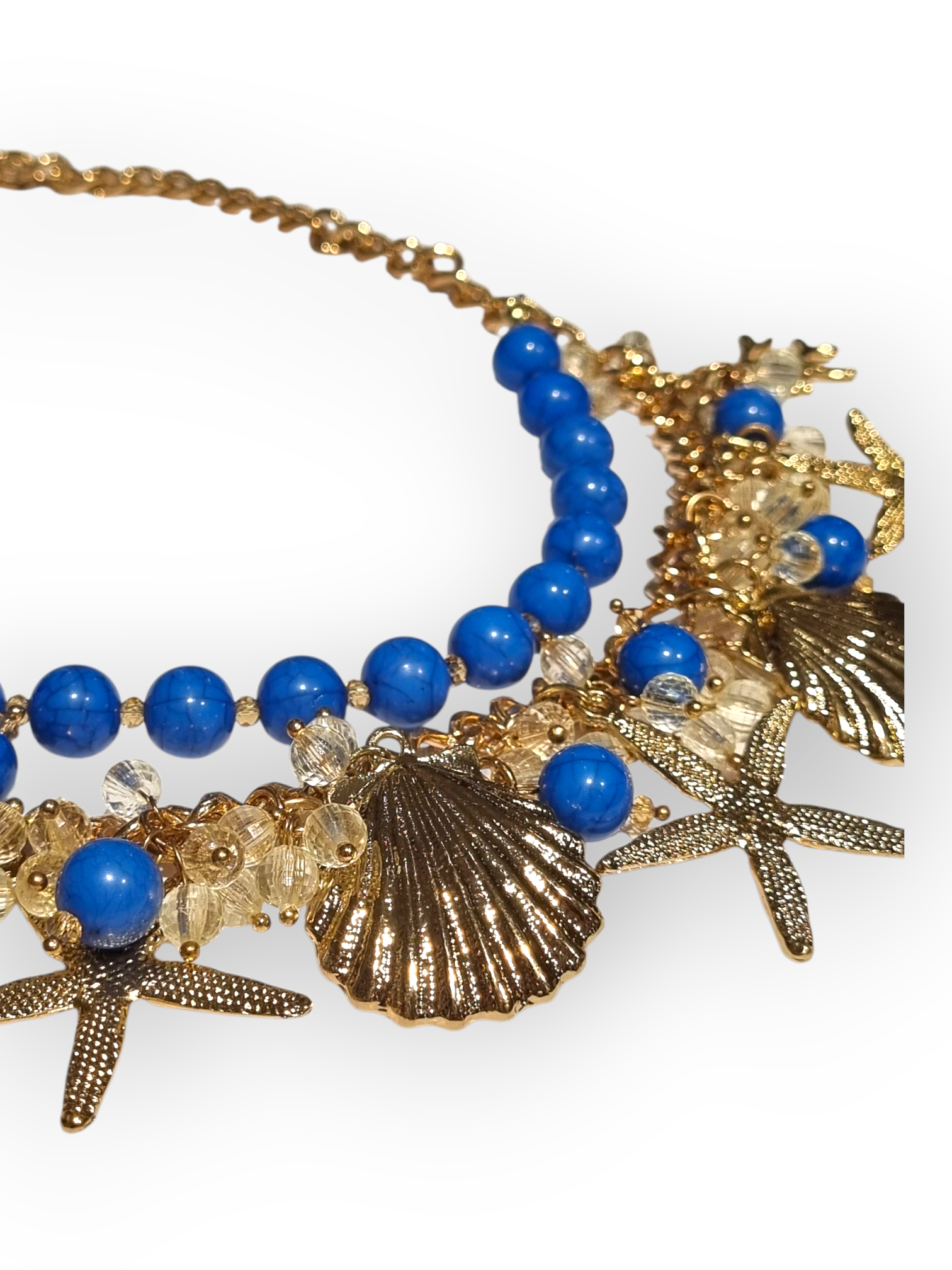 Merenneidon kaulakoru, jossa koristeena erilaisia helmiä, simpukoita, meritähtiä ja merikasveja.