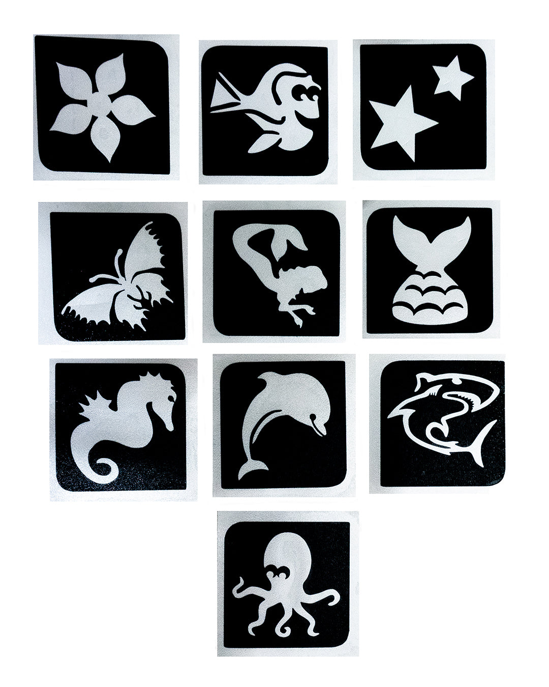 Meriteemainen kasvomaalauskäyttöön ja glittertatuointeihin tarkoitettu sapluunasetti, jolla loihdit näyttävät kuvioinnit iholle kätevästi, helposti ja tarkasti.