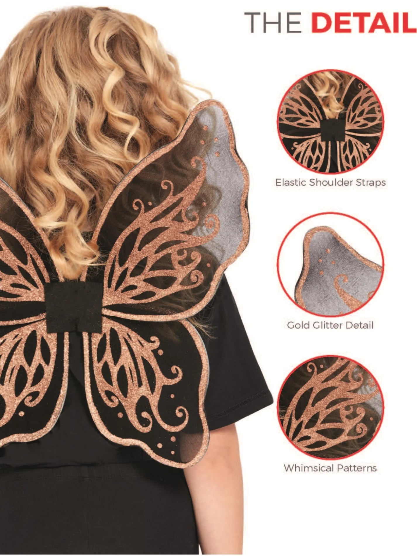 Yksinkertaisesti kauniit mustat perhosen tai keijun siivet, joiden kuviointi pronssin/kullanväristä glitteriä.