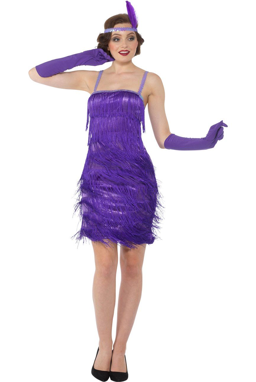 - Samettinen violetti mekko, jossa etuosassa runsaat flapper-hapsut. Takaosa samettia, ei hapsuja. Takana pukeutumista helpottava vetoketju ja ylälaidassa kuminauha. Olkaimet joustavat ja paljettipäällysteiset.