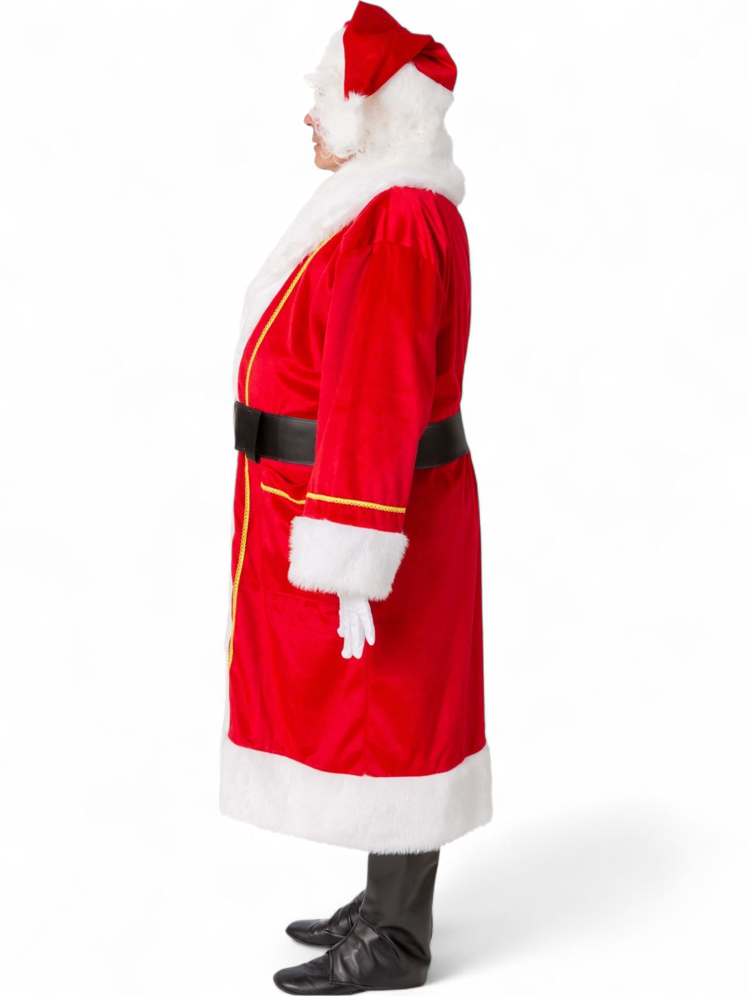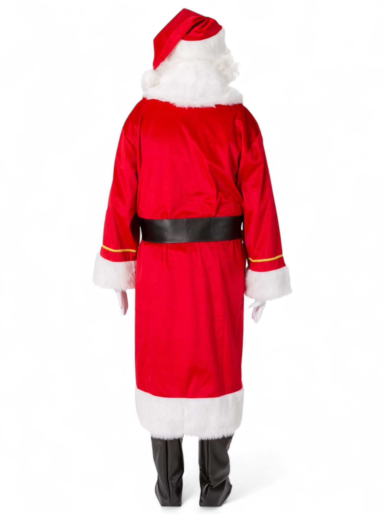 Pitkässä joulupukin takki eli mantteli pehmeää ja laadukasta samettia. Manttelin yläosassa ja keskellä tarranauhakiinnitys. Leveä kaulus tekoturkistehosteella ja miehustaan ommellut kultaiset yksityiskohdat täydentävät kokonaisuuden.