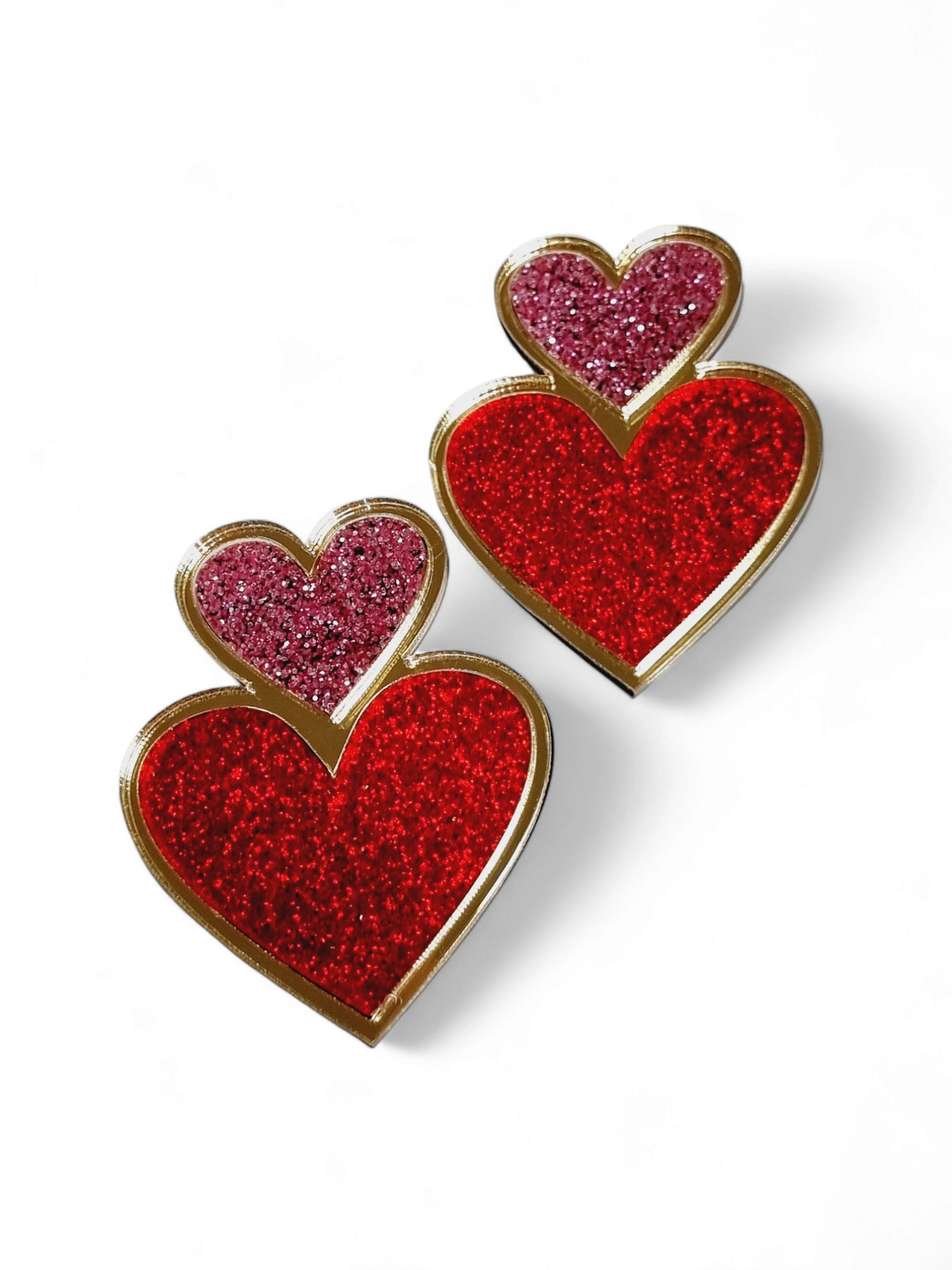 Kahdesta glittersydämestä muodostuvat korvikset, joista ei säihkettä puutu. Ylempi glittersydän vaaleanpunainen, alempi kirkkaanpunainen. Tukeva nappikiinnitys leveällä takaosalla, tapit kirurginterästä. Korujen korkeus 6cm, leveys max 4cm.