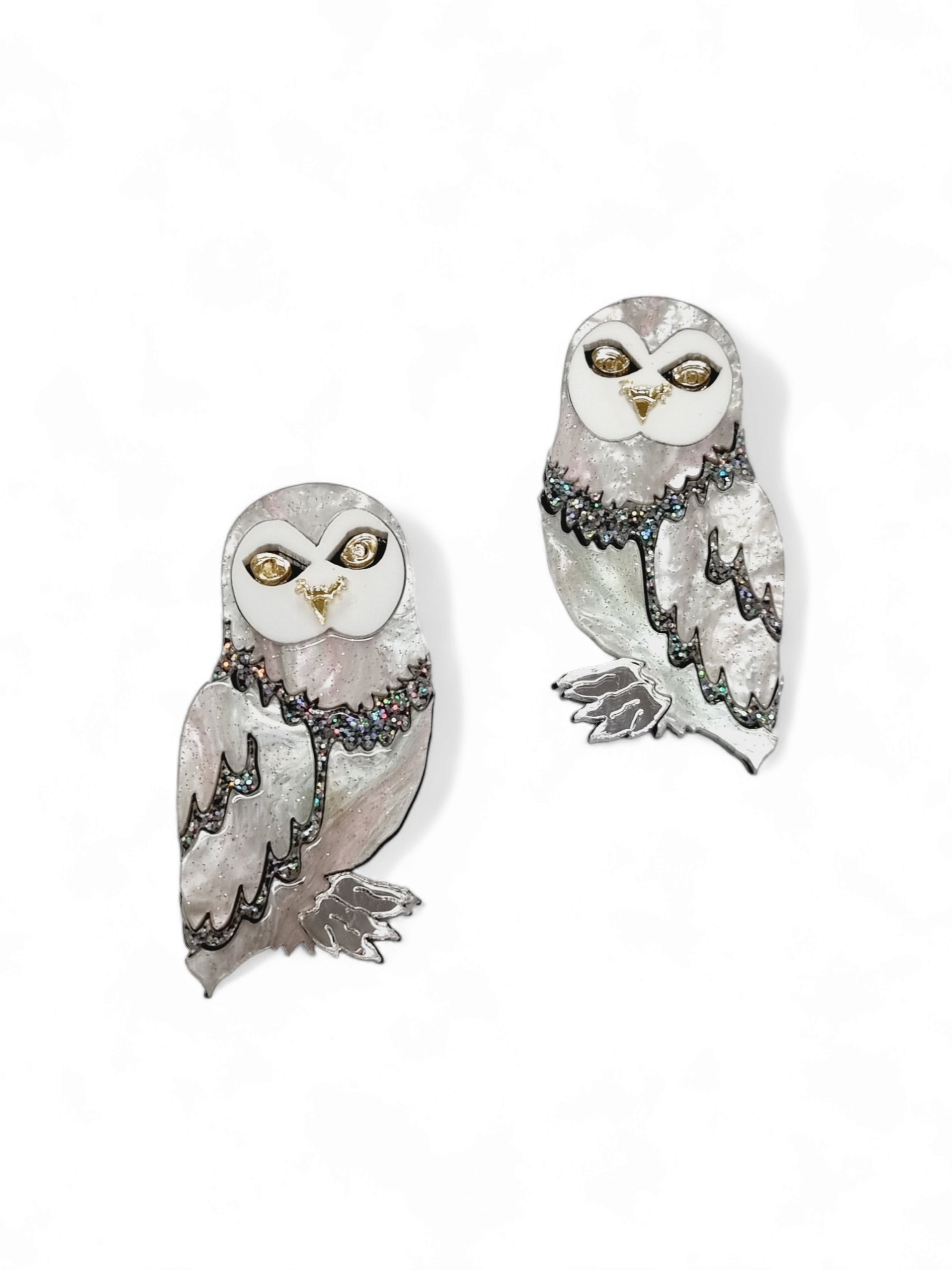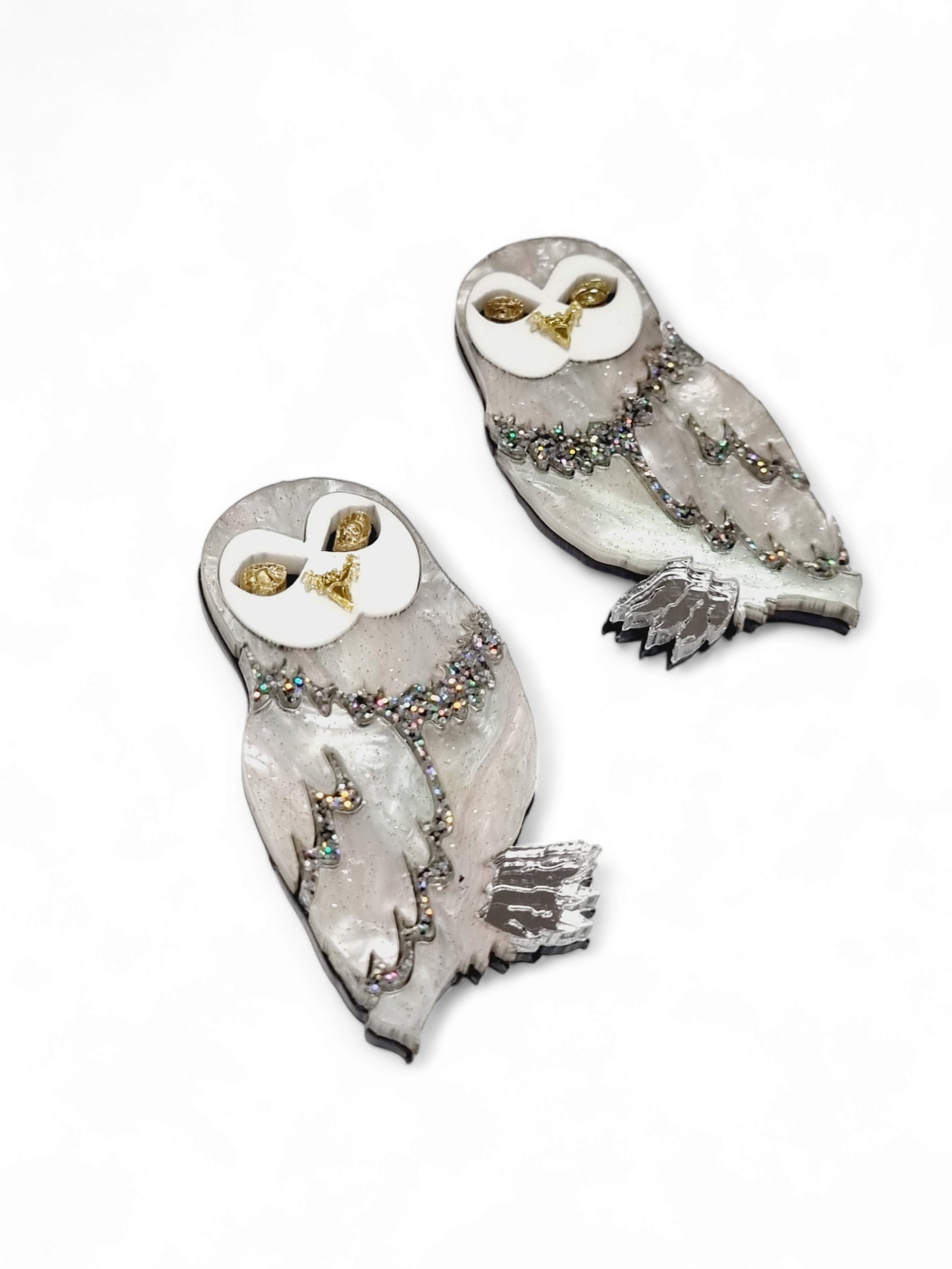 Upeasti kimaltavat, kevyet ja ihanat korvakorut, joissa pysäyttävän hieno pöllöhahmo, sopivasti pientä kullanväristä ja hopeista yksityiskohtaa sekä ripaus glitteriä. Tukeva nappikiinnitys leveällä takaosalla, tapit kirurginterästä. Korujen korkeus 5cm, leveys 2,5cm.