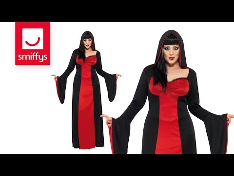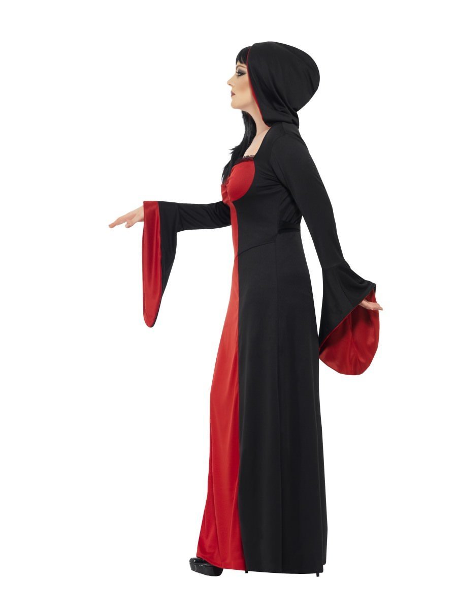 Täyspitkä hupullinen mekko sopii esimerkiksi halloweeniin, kuningattarelle, vampyyrille, noidalle, ennustajaeukolle, viikatenaiselle, keskiaikajuhliin ja monenlaisiin muihin lookeihin. Mekko on miellyttävä päällä, kangas on pehmeää ja hyvin laskeutuvaa napakkaa trikoota. Leveät trumpettihihat joissa punainen sisäosa. Pääntiellä edessä pieni musta pitsi.