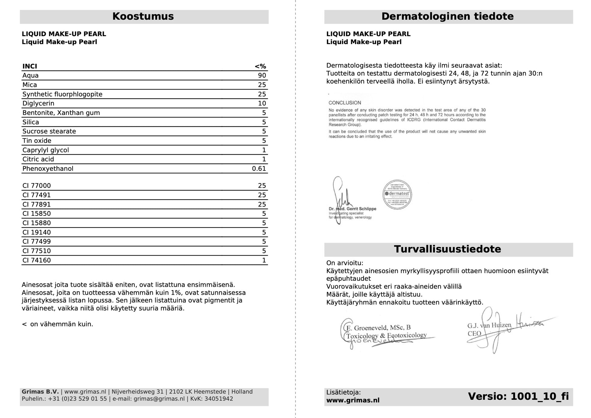 Grimas Liquid Make-up on nestemäinen kasvomaali, joka taipuu niin vasta-alkajan kuin superammattilaisenkin luottotuotteeksi. Peittävä pinta kestää kuivuttuaan vahvempaakin kosketusta tahraamatta, mutta peseytyy pois lämpimällä vedellä.