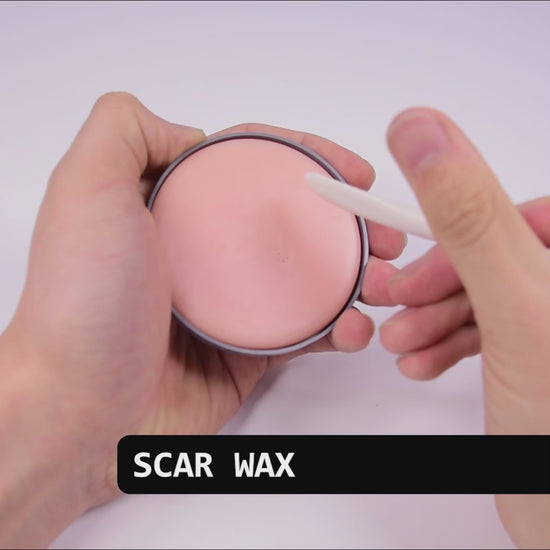 Ota tarvittava määrä Scar Waxia pakkauksesta arpivahalastalla. Pehmitä vaha hieromalla sitä kevyesti sormien välissä. Halutessasi voit värjätä arpivahan tässä vaiheessa esimerkiksi meikkivoiteella tai luomivärillä – sekoita väri huolellisesti vahaan sormilla.