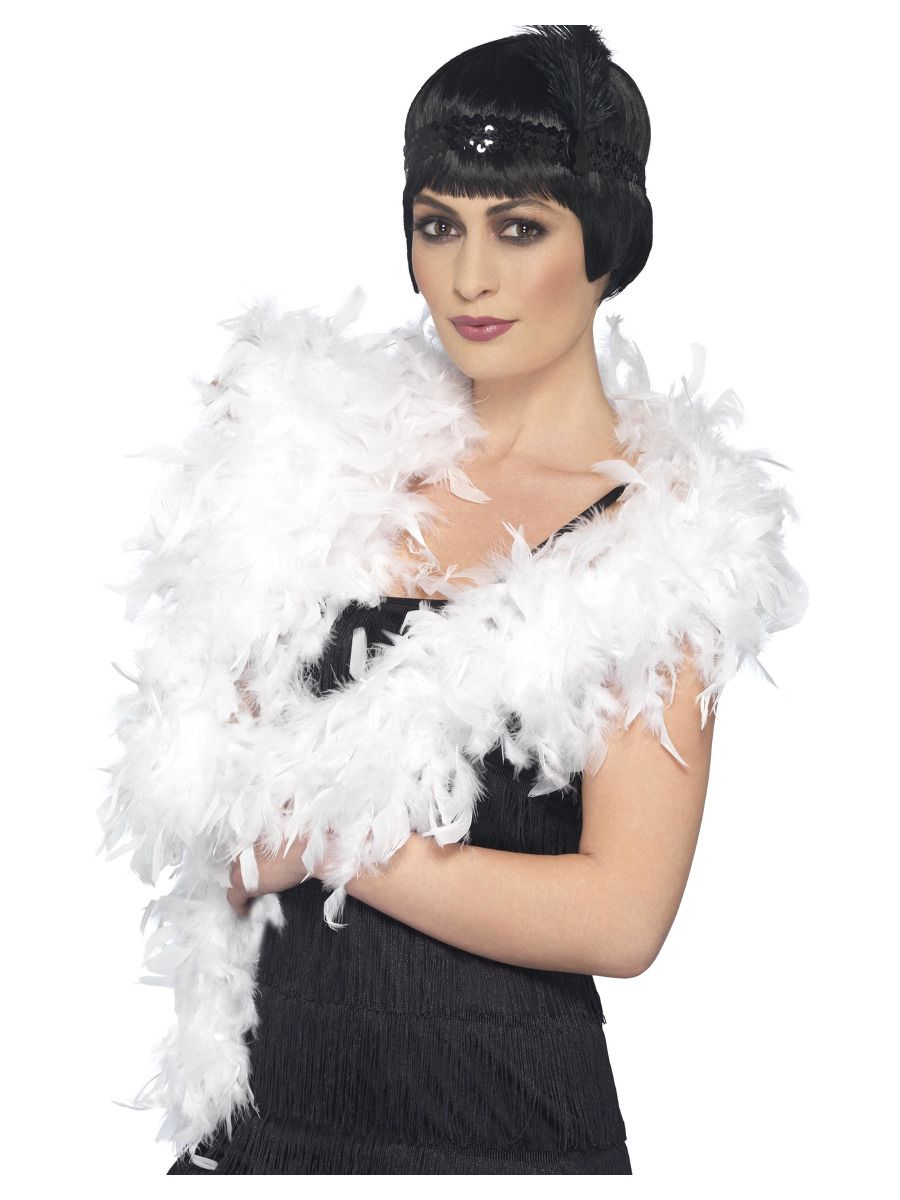Upean muhkea kirkkaanvalkoinen puuhka 1920-luvun tyyliin, burleskiin ja muihin teemajuhliin.