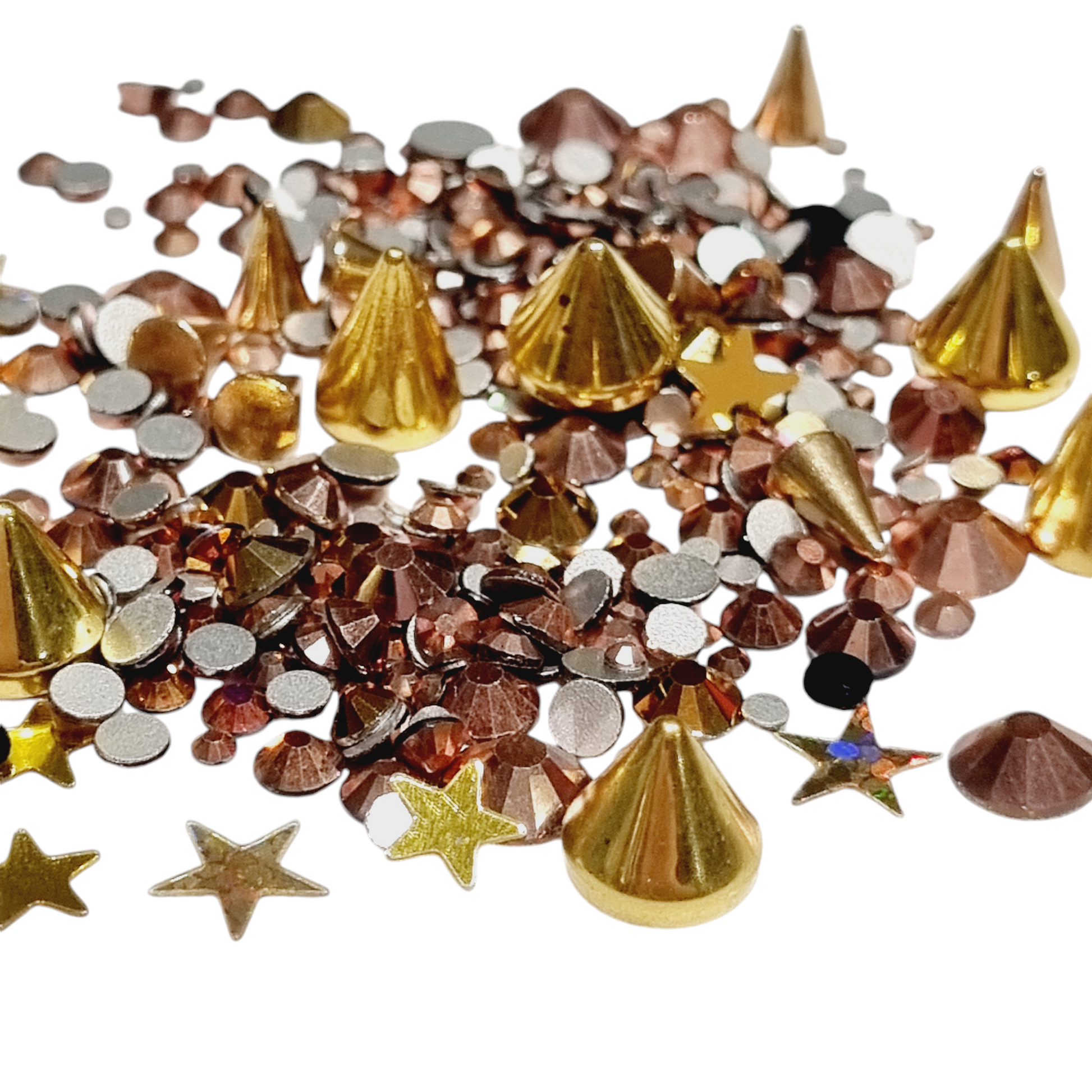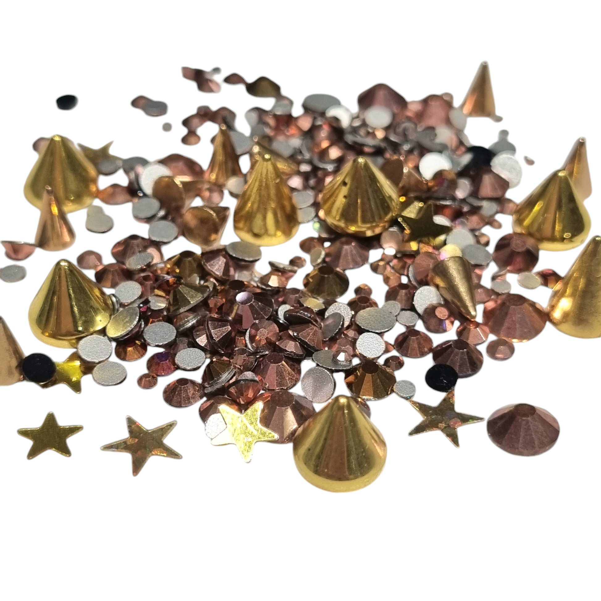 Sekoitus eri muotoisia kullanvärisiä akryylistrasseja.