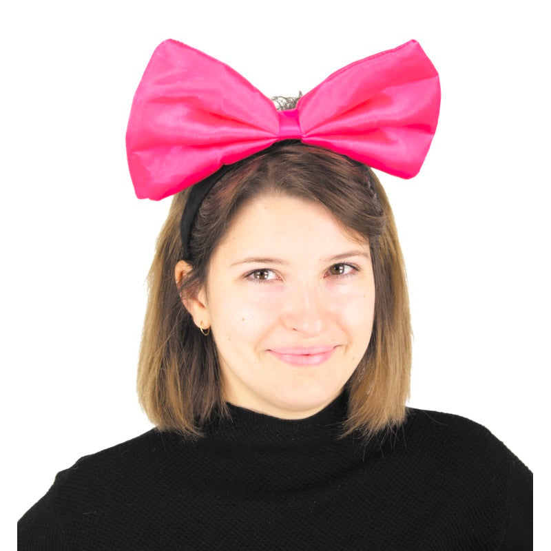 Tämä jättikokoinen rusetti on pantakiinnitteinen, eli puetaan päähän kätevästi kuin hiuspanta. Väri on todella kirkas neonvärinen pinkki myös päivänvalossa, mutta uv-reaktiivinen ominaisuus saa sen hehkumaan myös mustavalojen alla esimerkiksi discoissa, yökerhoissa ja reiveissä.