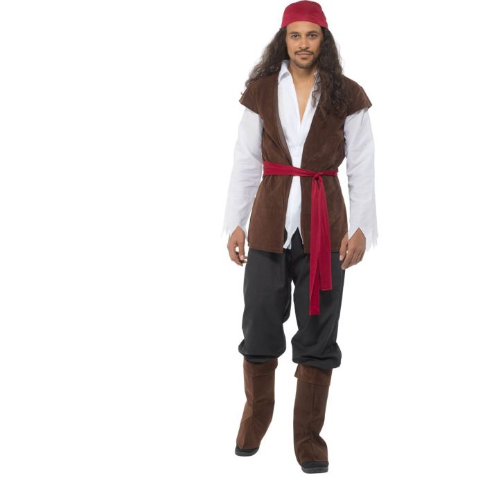 Merirosvon asukokonaisuus (paita, liivi, housut, vyö, huivi ja saapassuojat)