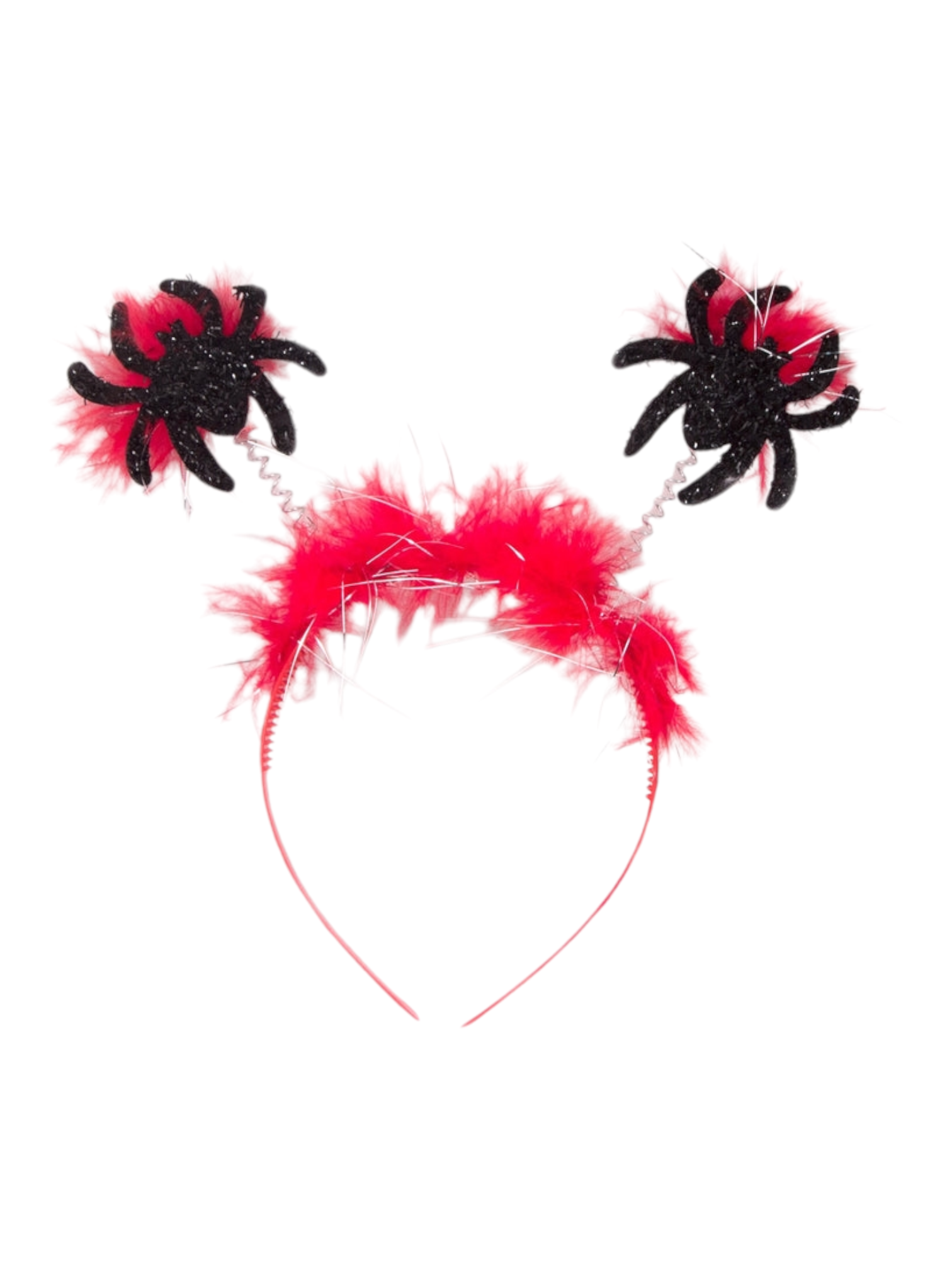 Punainen muovinen pääpanta jossa keikkuu vieterien varassa kaksi mustaa, kimmeltävää hämähäkkiä. Lisäkoristeena punaisia höyhenkoristuksia ja hopeahilettä.