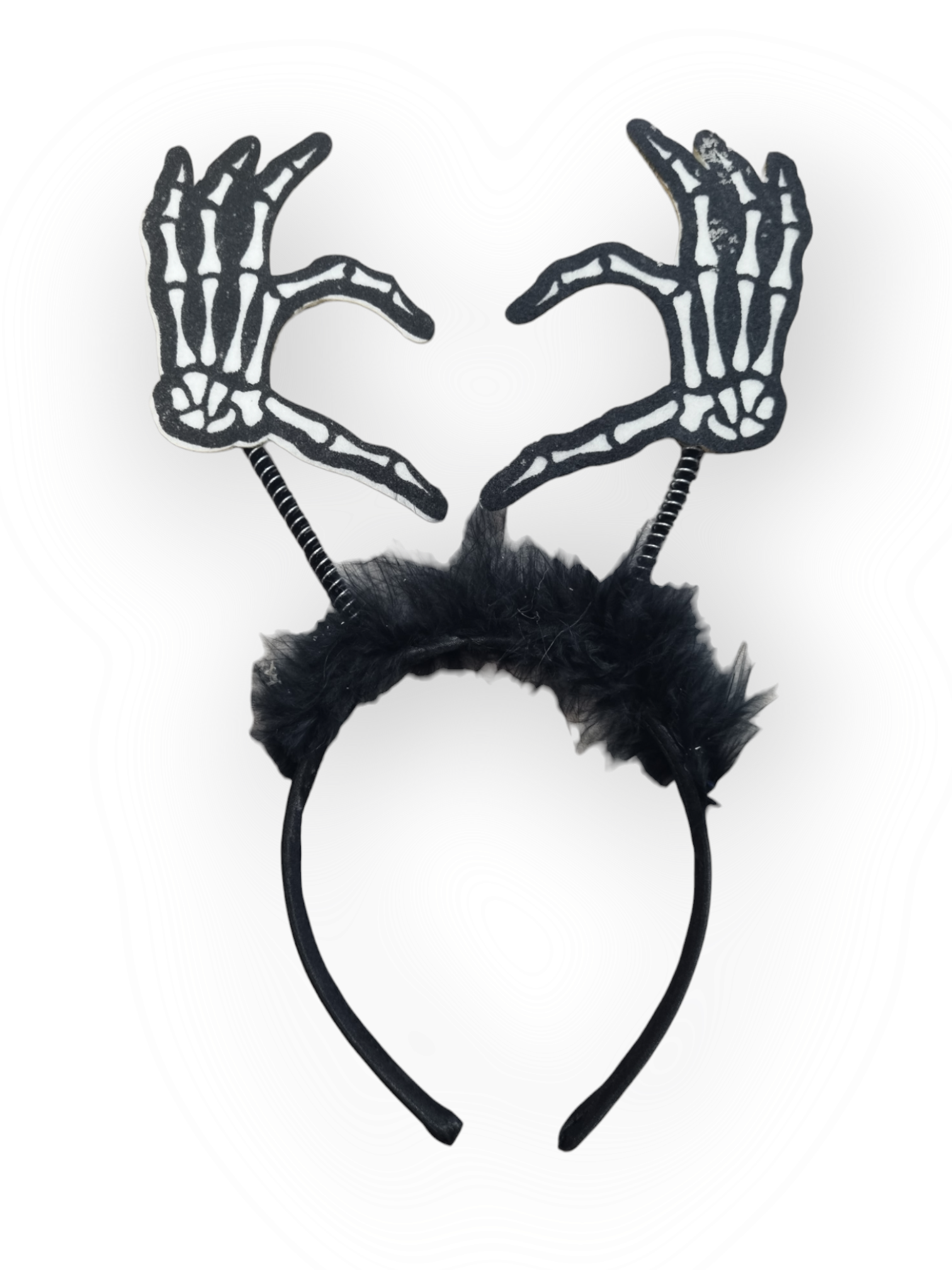 Musta höyhenkoristeinen pääpanta, jonka laella keikkuu kaksi luurankokättä vieterien varassa.