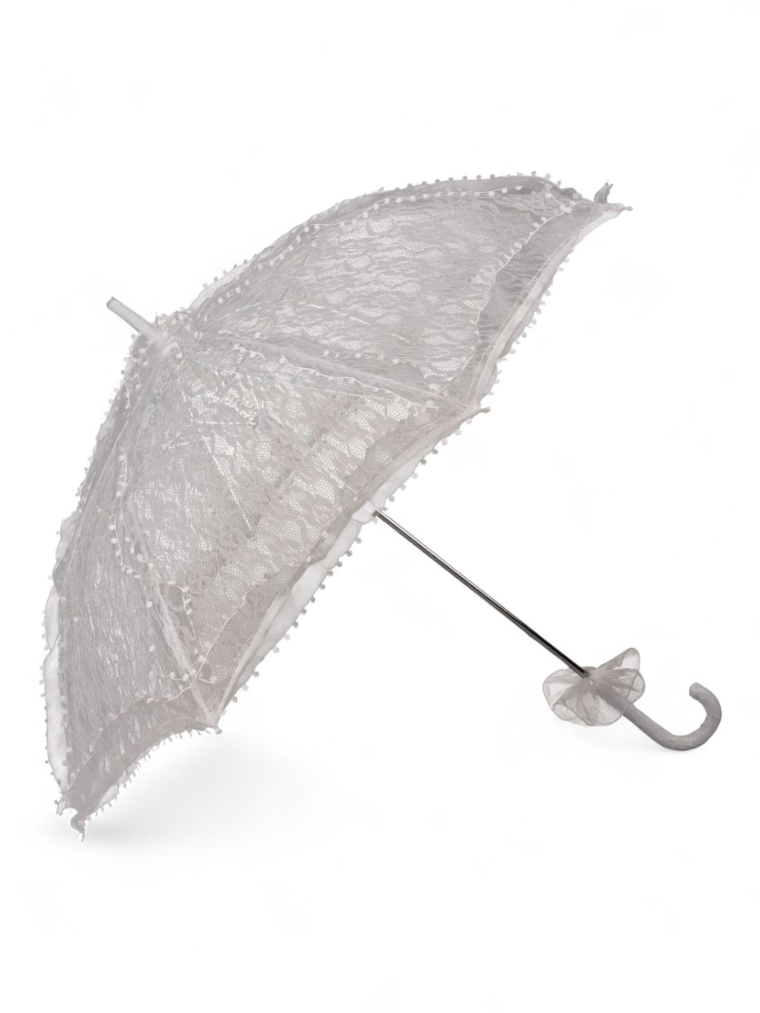 Kauttaaltaan läpikuultava pitsinen päivänvarjo muovisella varrella. Toimii samalla tavalla kuin perinteiset sateenvarjot.