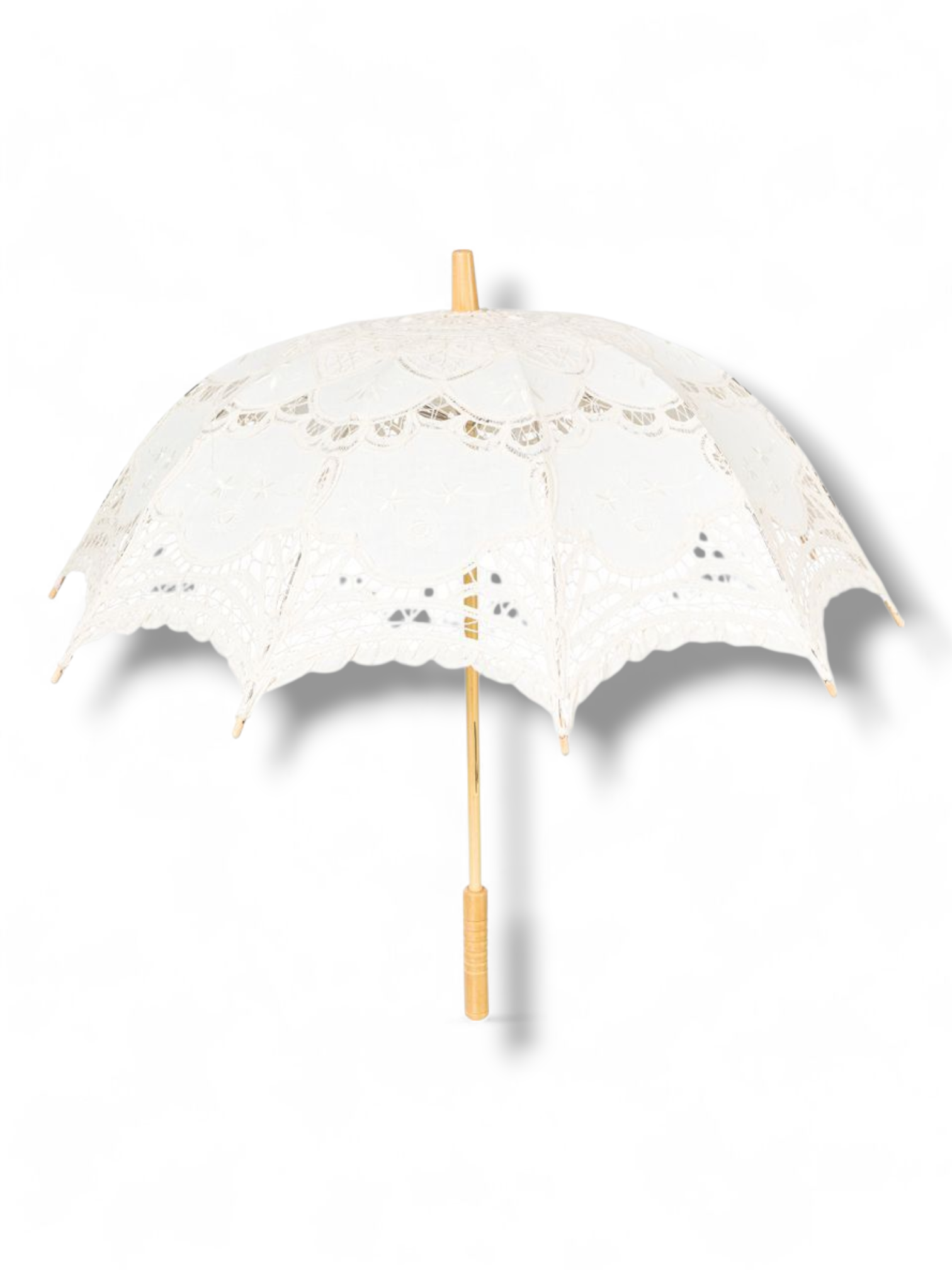 Kaunis pitsikuvioitu päivänvarjo tukevalla puisella varrella. Toimii samalla tavalla kuin perinteiset sateenvarjot.