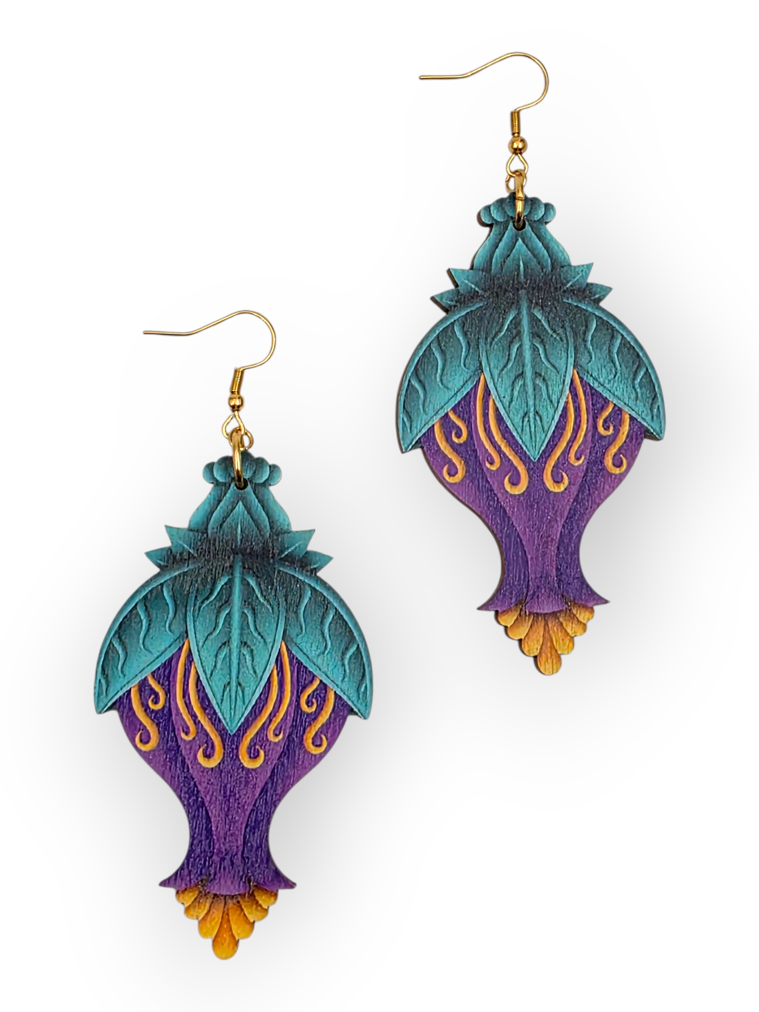Korujen materiaali suomalaista koivuvaneria, metalliosat terästä. Mukana kumiset stopperit, jotka pitävät korvakorut paikallaan korvissasi.