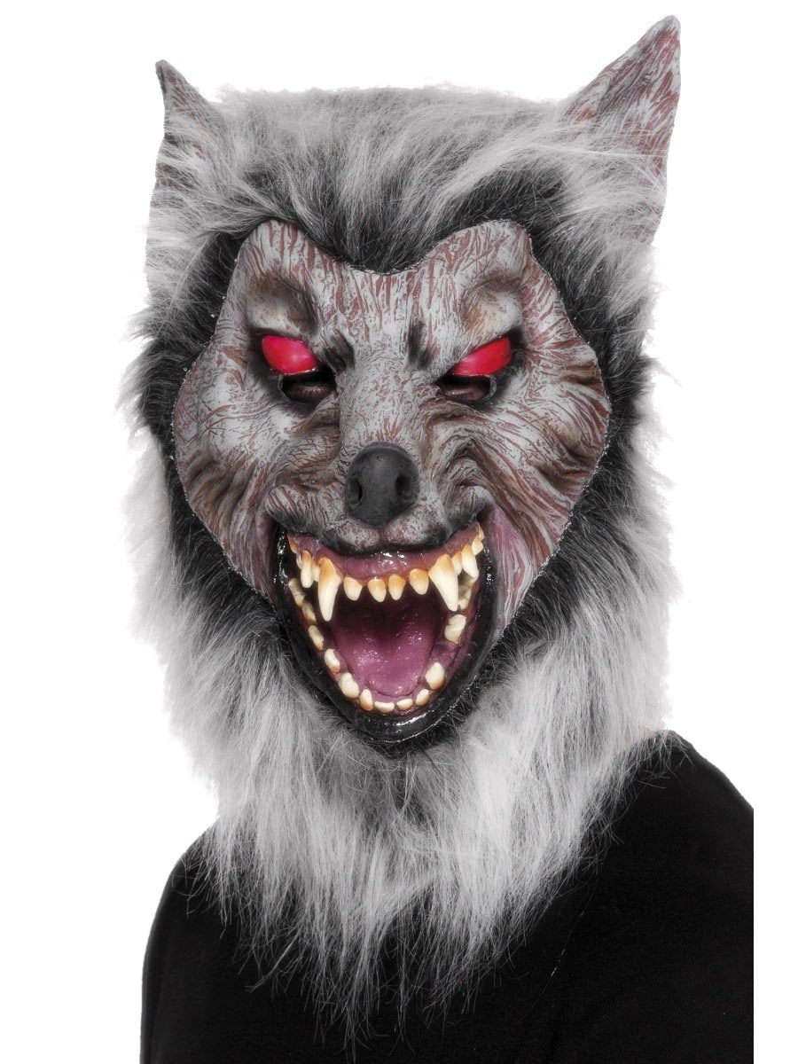 Pään peittävä susi- tai ehkä ennemminkin ihmissusinaamari pehmeää lateksia. Punaiset silmät ja hurjat hampaat, ei herkimpien valinta.