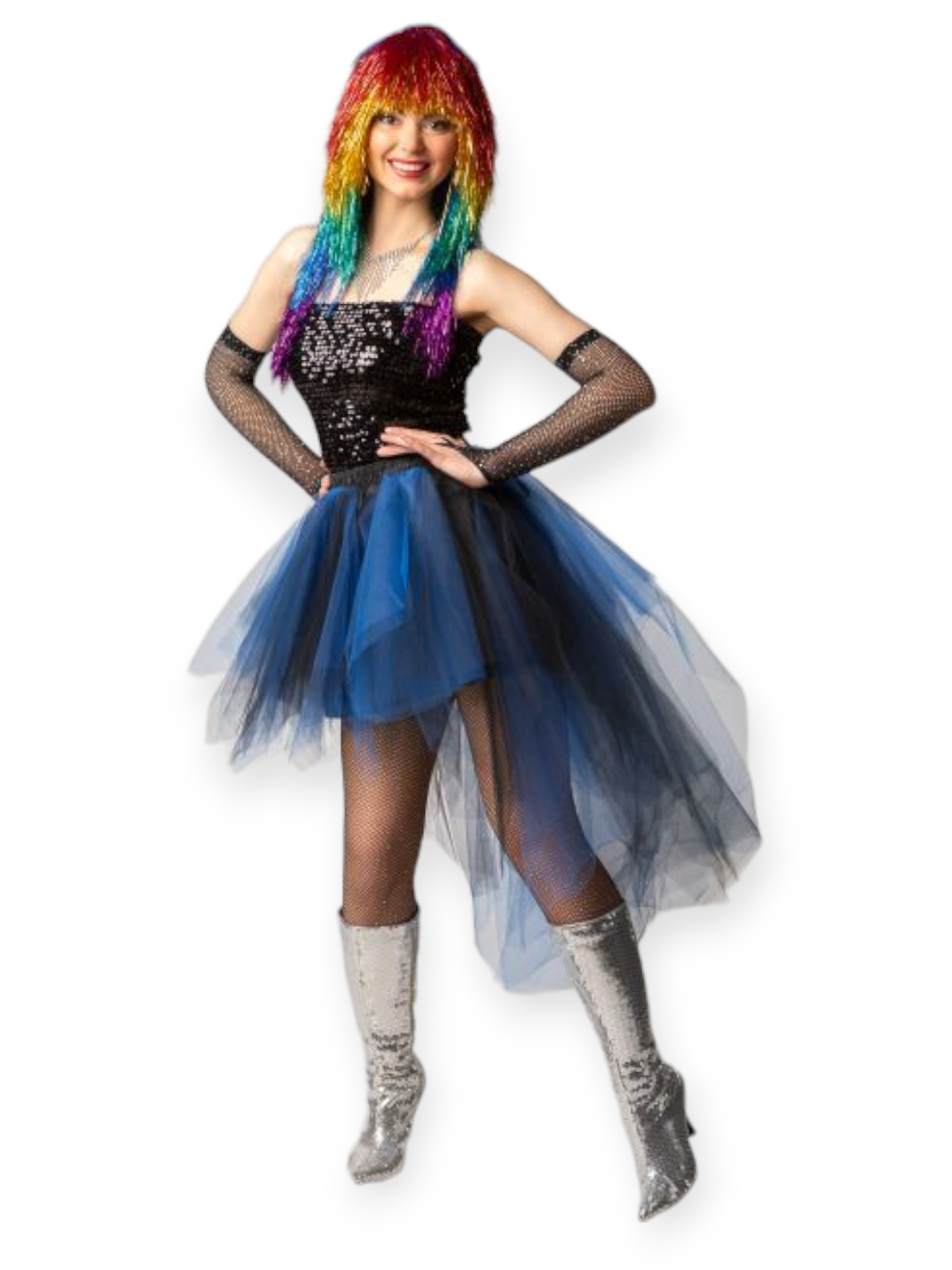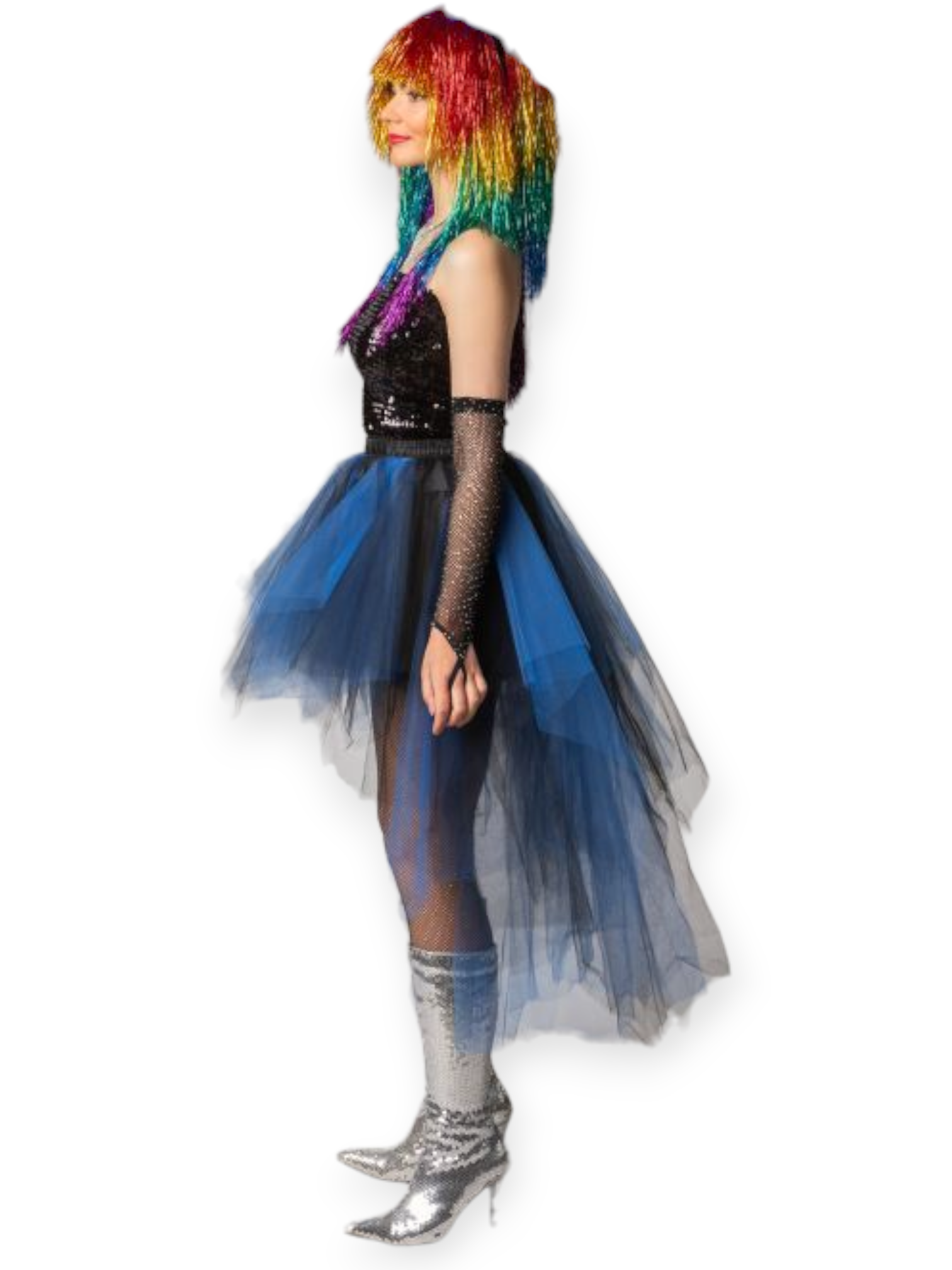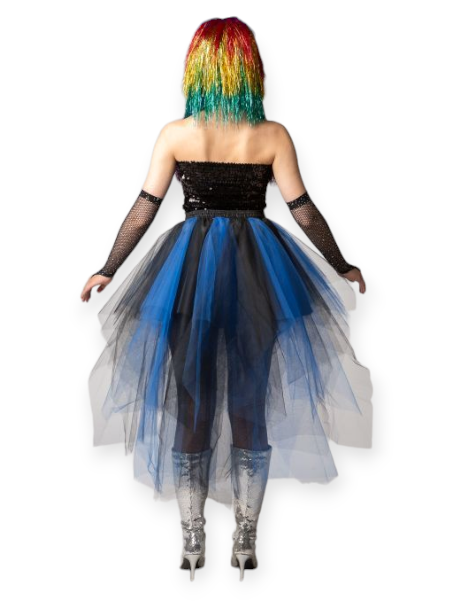 Näyttävä tyllihame, jossa mustan alushameen päällä mustaa ja sinistä tylliä kerroksittain. Ihana keijuhame metsäbileisiin, harlekiinin hame sirkusteemaan tai vaikka räväkkä festariasuste sinulle, joka haluat pukea päällesi jotain, mitä ei tavallisista kaupoista saa. Onneksi on Metkunen! <3