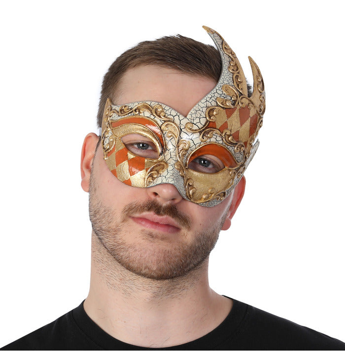 Olipa suuntanasi perinteikkäät naamiaiset, karnevaalit tai masquerade-tanssijaiset, 1920-luvun cabaret-aiheiset teemajuhlat tai anonyymiteettia vaativat kutsuvierasbileet, on tässä oiva valinta asuasi täydentämään. Tämä historiallista aikaa henkivä kipsinen naamio on pinnaltaan kolmiulotteinen ja kauniisti maalattu ja se solmitaan pään taakse mustin satiininauhoin.