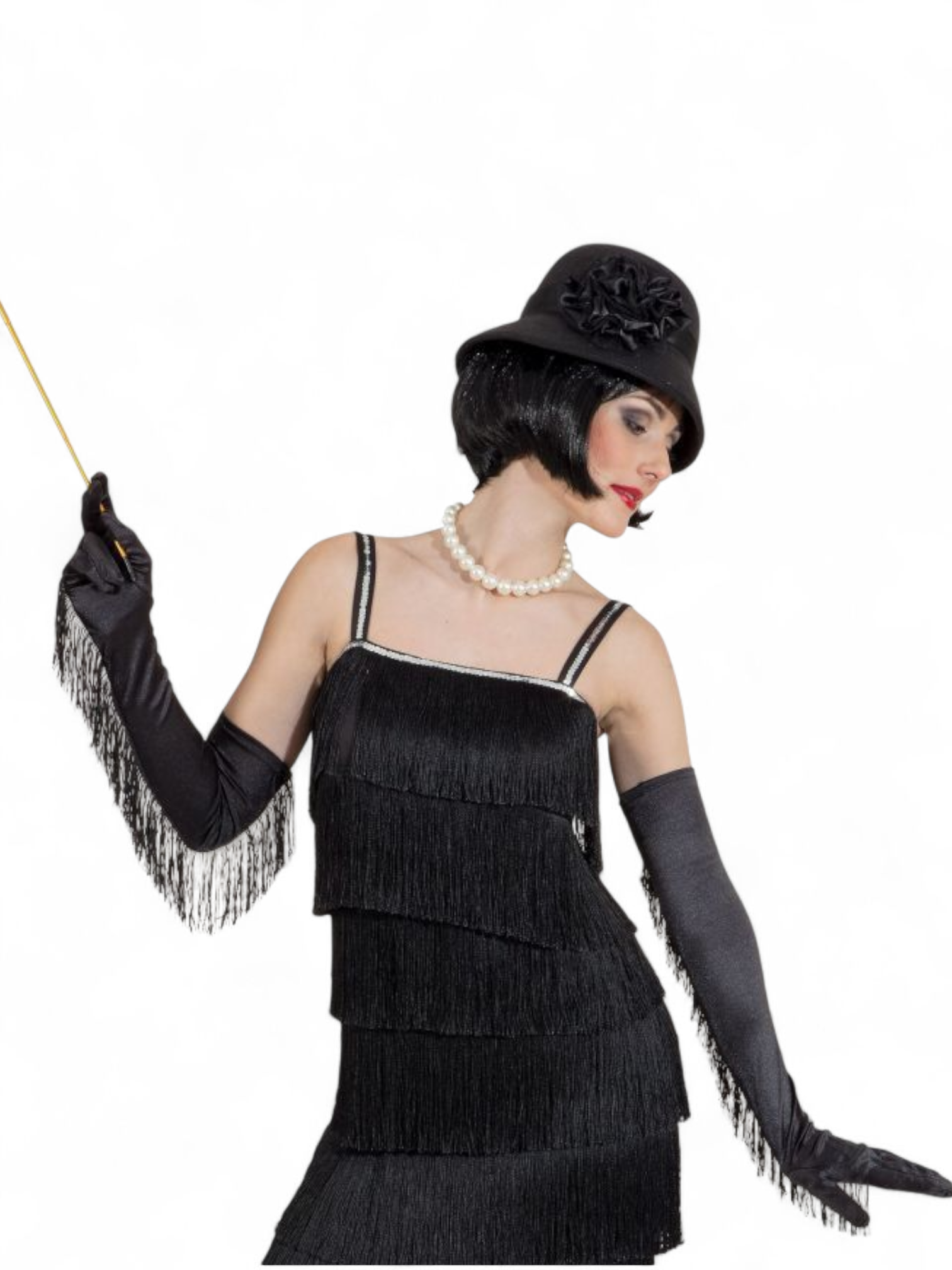 Yli kyynärpään ulottuvat satiinikäsineet hapsuilla Flapper